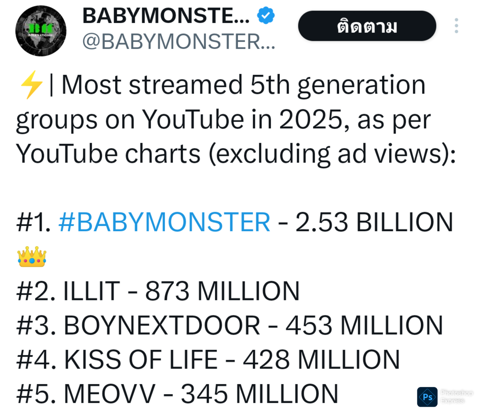 BABYMONSTER เป็นวงเคป๊อปเจน 5 รวมชายหญิงที่มียอดสตรีมบน YouTube มากที่สุดโดยไม่รวม Ad Views ในปี 2025