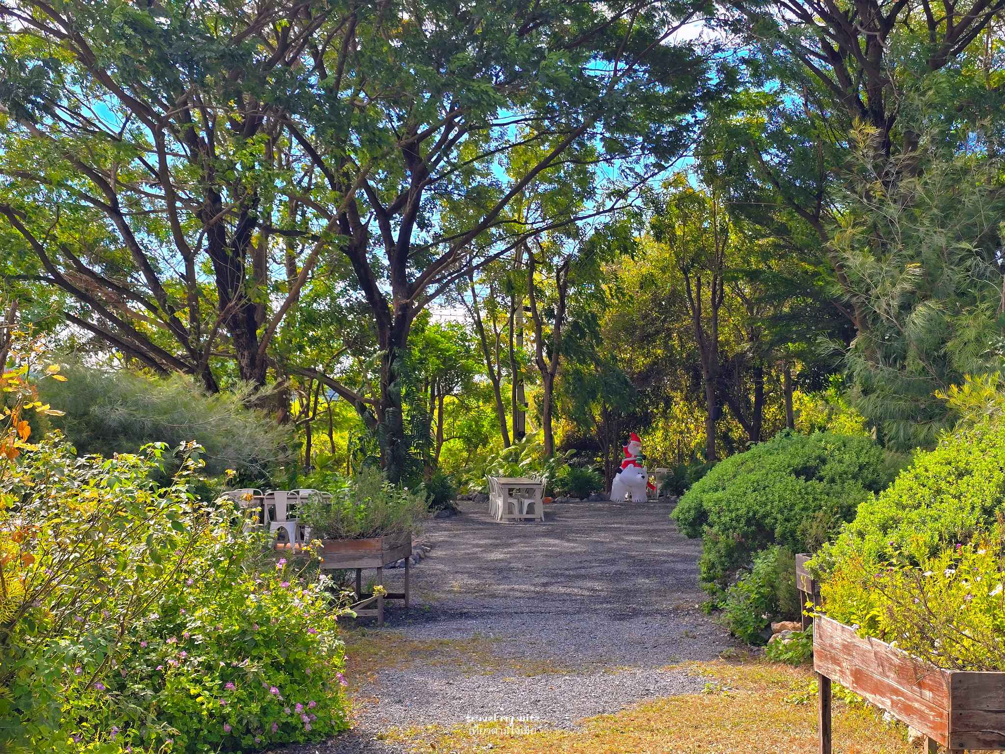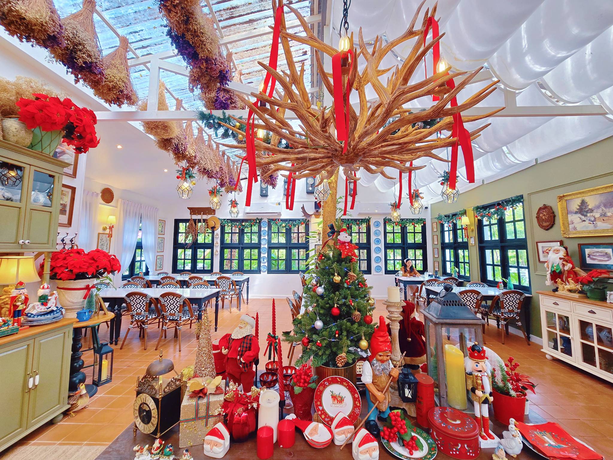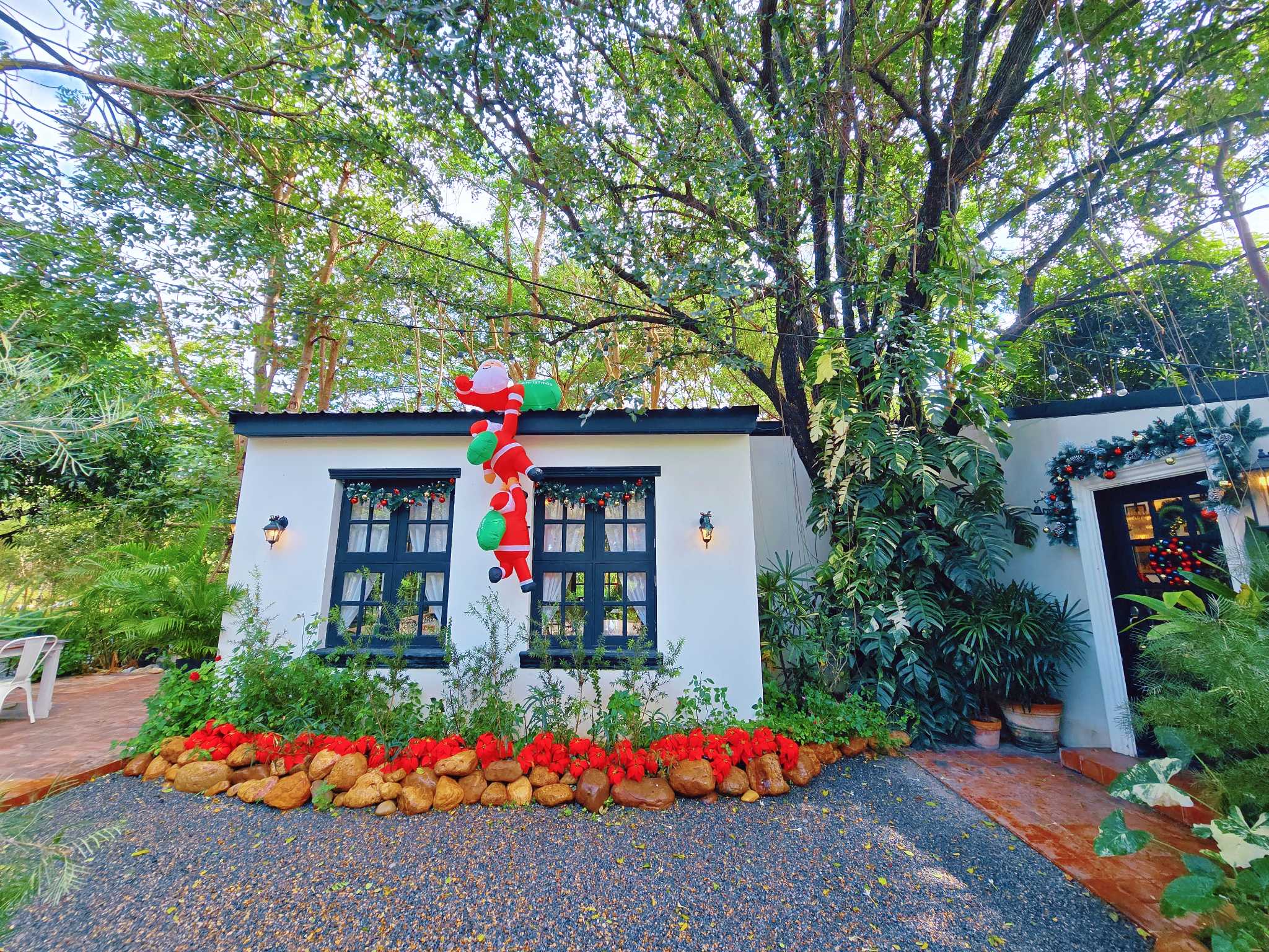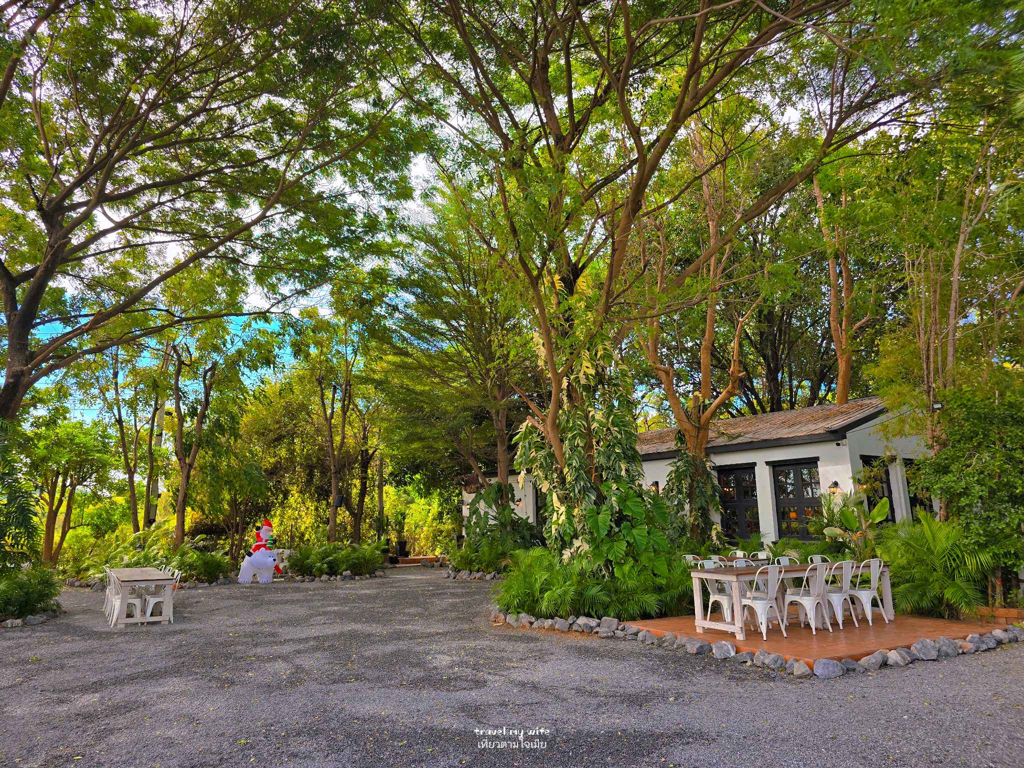 คาเฟ่บ้านสวนสไตล์อังกฤษ บรรยากาศร่มรื่นมากครับและรายล้อมด้วยต้นไม้น้อย ใหญ่ ด้านหลังวิวภูเขา แต่ละมุมของร้านเค้าจัดออกมาได้น่ารักมาก ยิ่งช่วงนี้ใกล้คริสต์มาสตกแต่งน่ารักเลยส่วนด้านนอก โซนสวนก็มีดอกไม้หลากหลายสีสันสดใส รอบๆร้าน โต๊ะสีขาวตัดกับต้นไม้สีเขียวจัดได้สวยงามลงตัวมาก