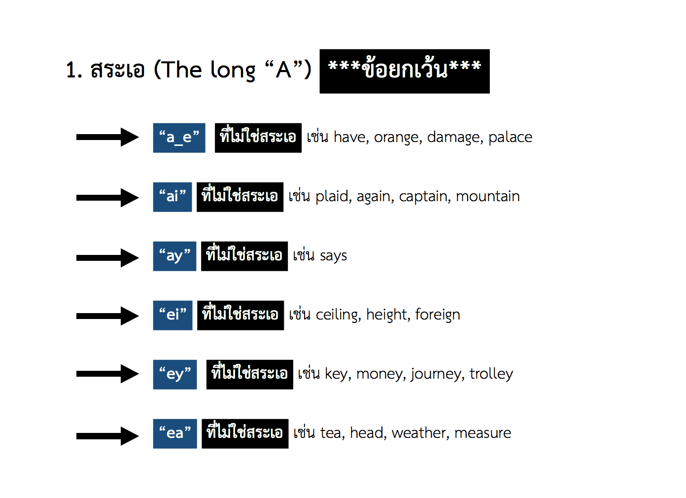 📌 สรุปหัวข้อก่อนหน้านี้คือ “สระเอ” มันสะกดได้ 6 แบบคือ a_e, -ai, -ay, -ei, -ey, -ea
