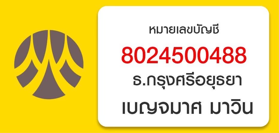 ชื่อบัญชี: เบญจมาศ มาวิน *****มี 2 แบงก์ (กรุงศรี ไทยพาณิชย์ )