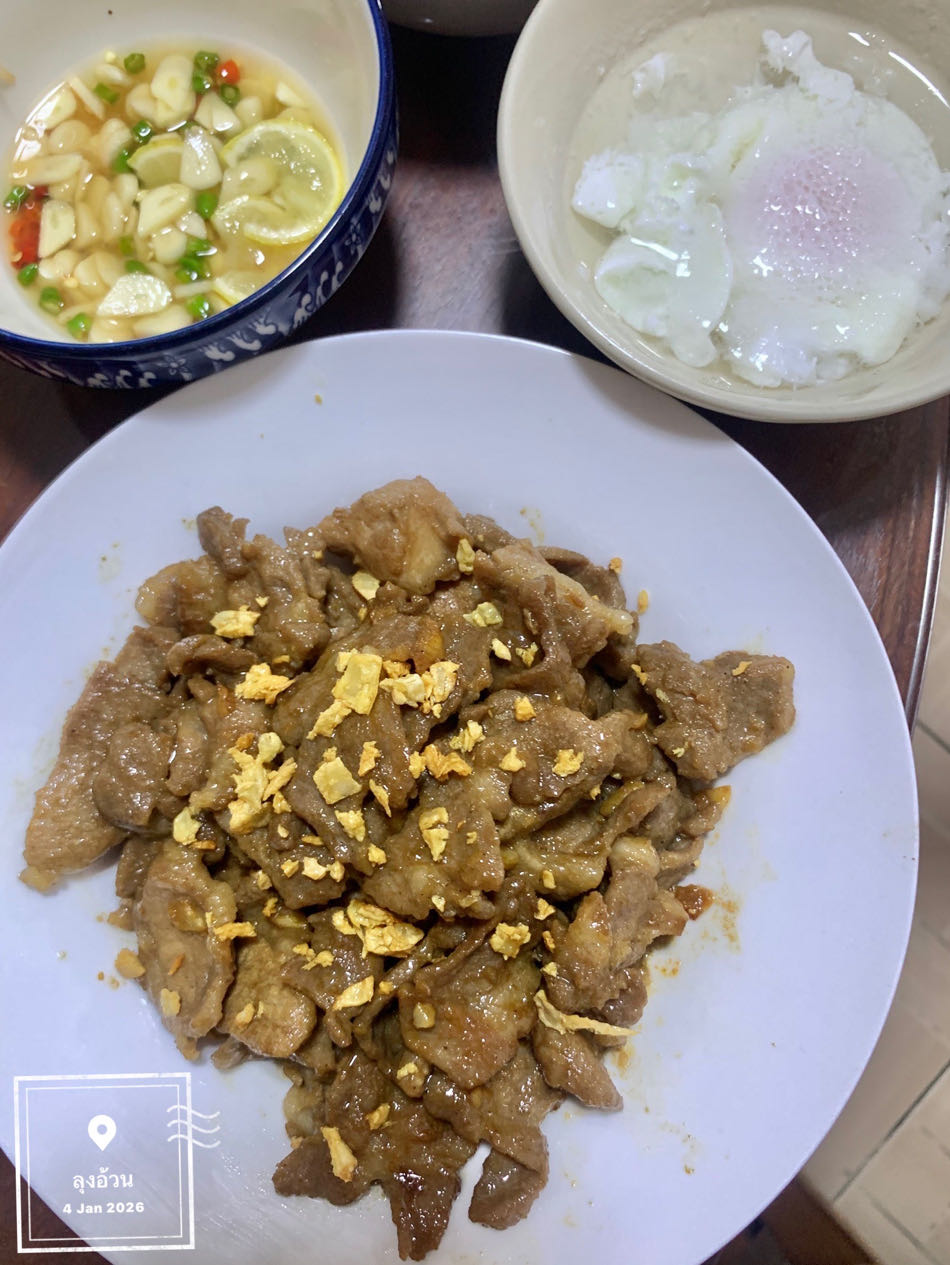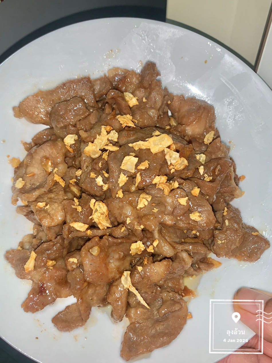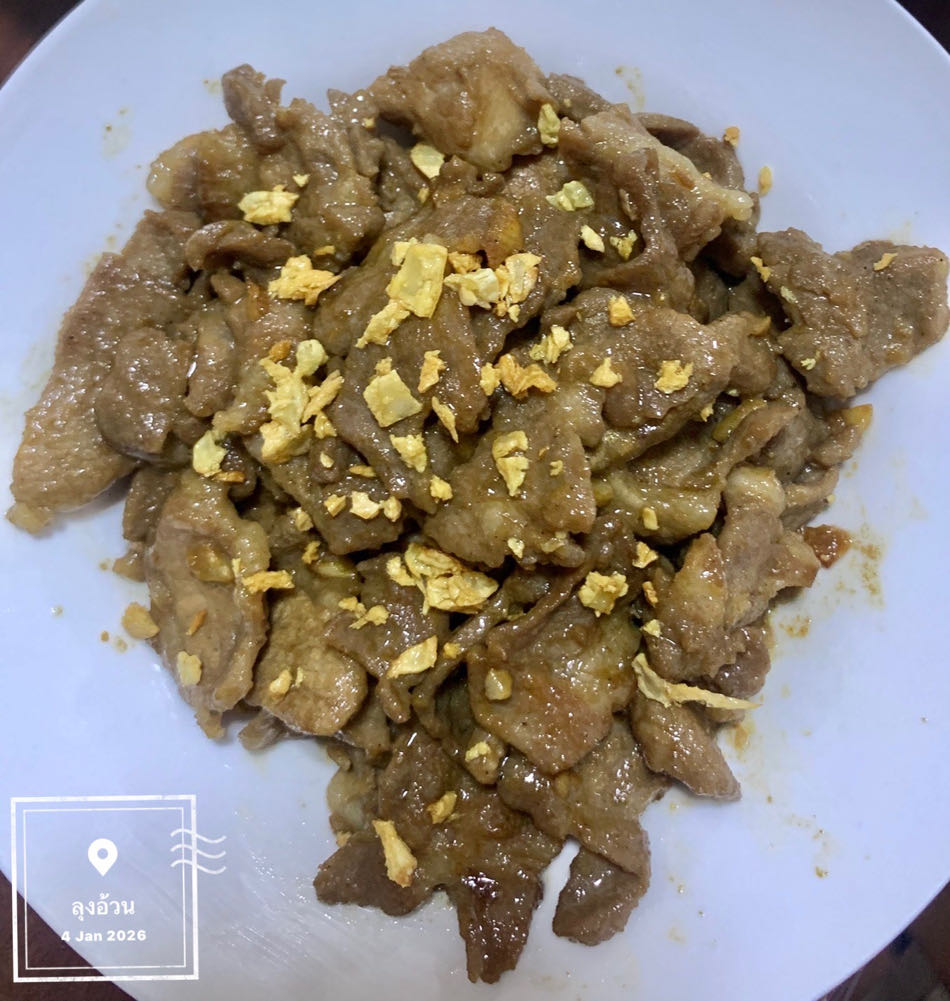 หมูกระเทียมโรยกระเทียมเจียวราดพริกน้ำปลา