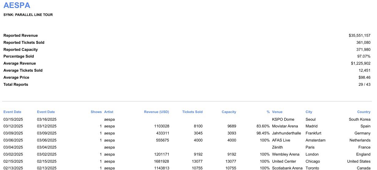 กำลังจะกลายเป็นทัวร์ที่มีผู้เข้าชมและมีรายได้มากที่สุดของเกิร์ลกรุ๊ปเจน 4 จากรายงานของ Touring Data