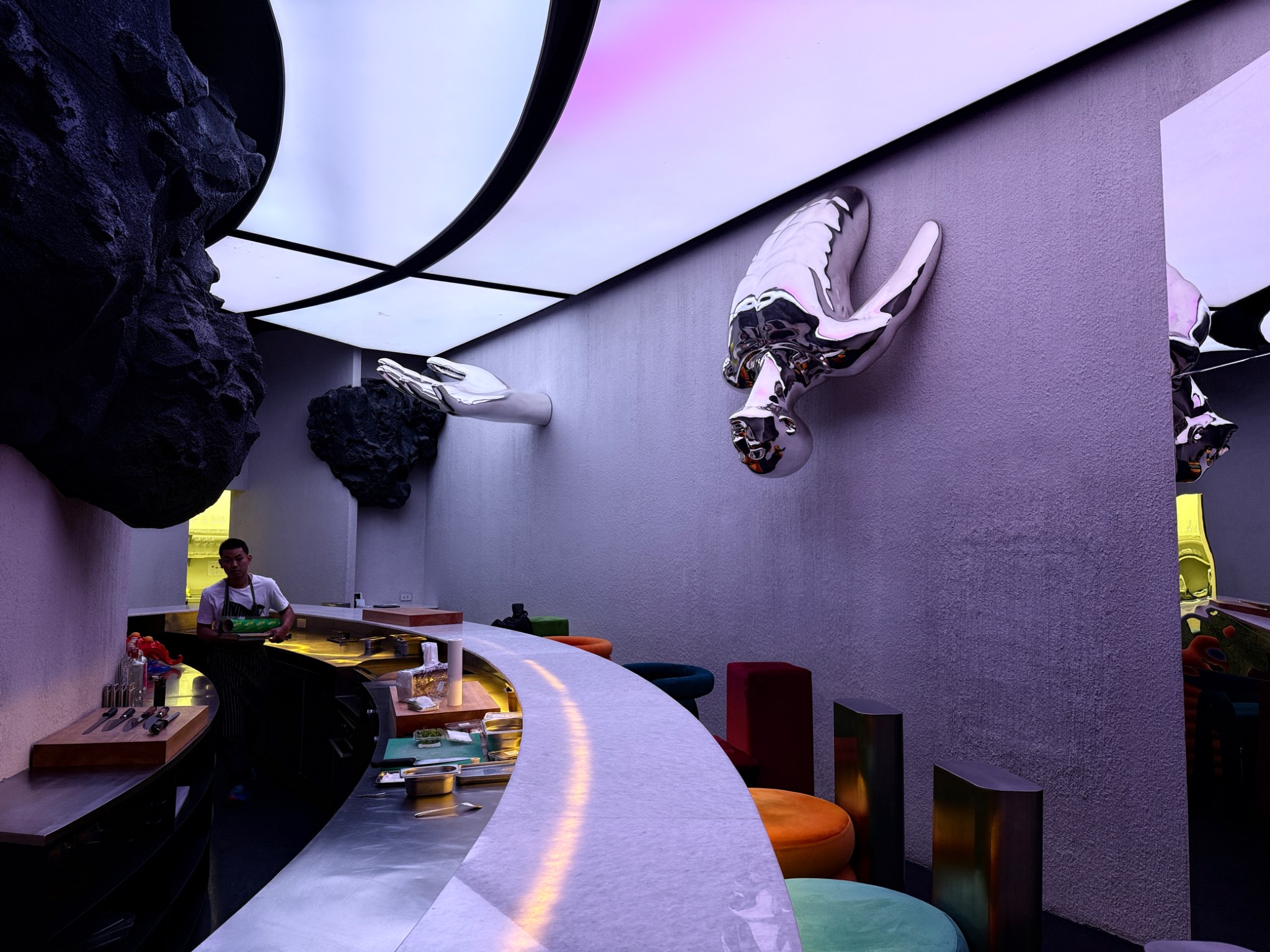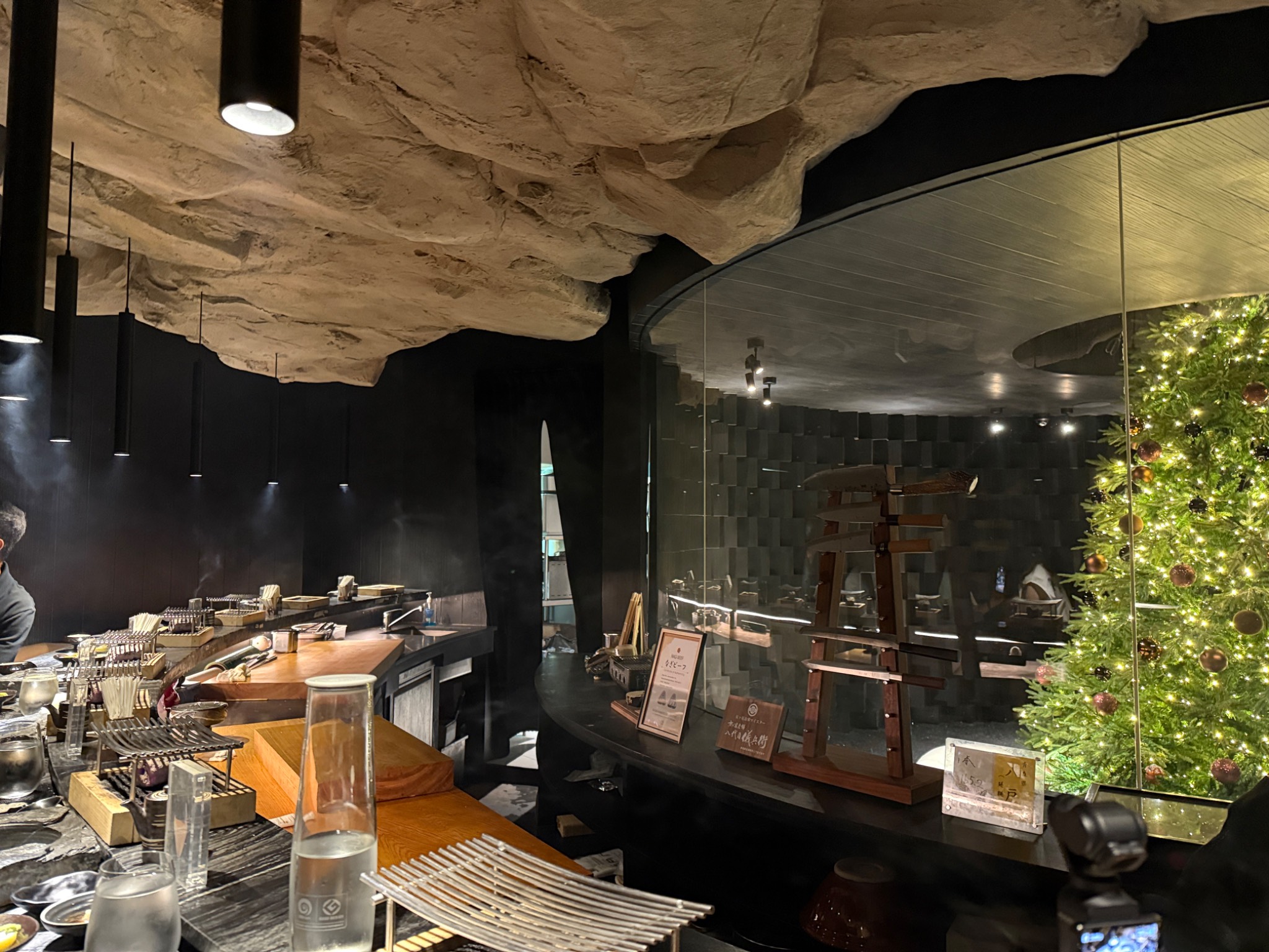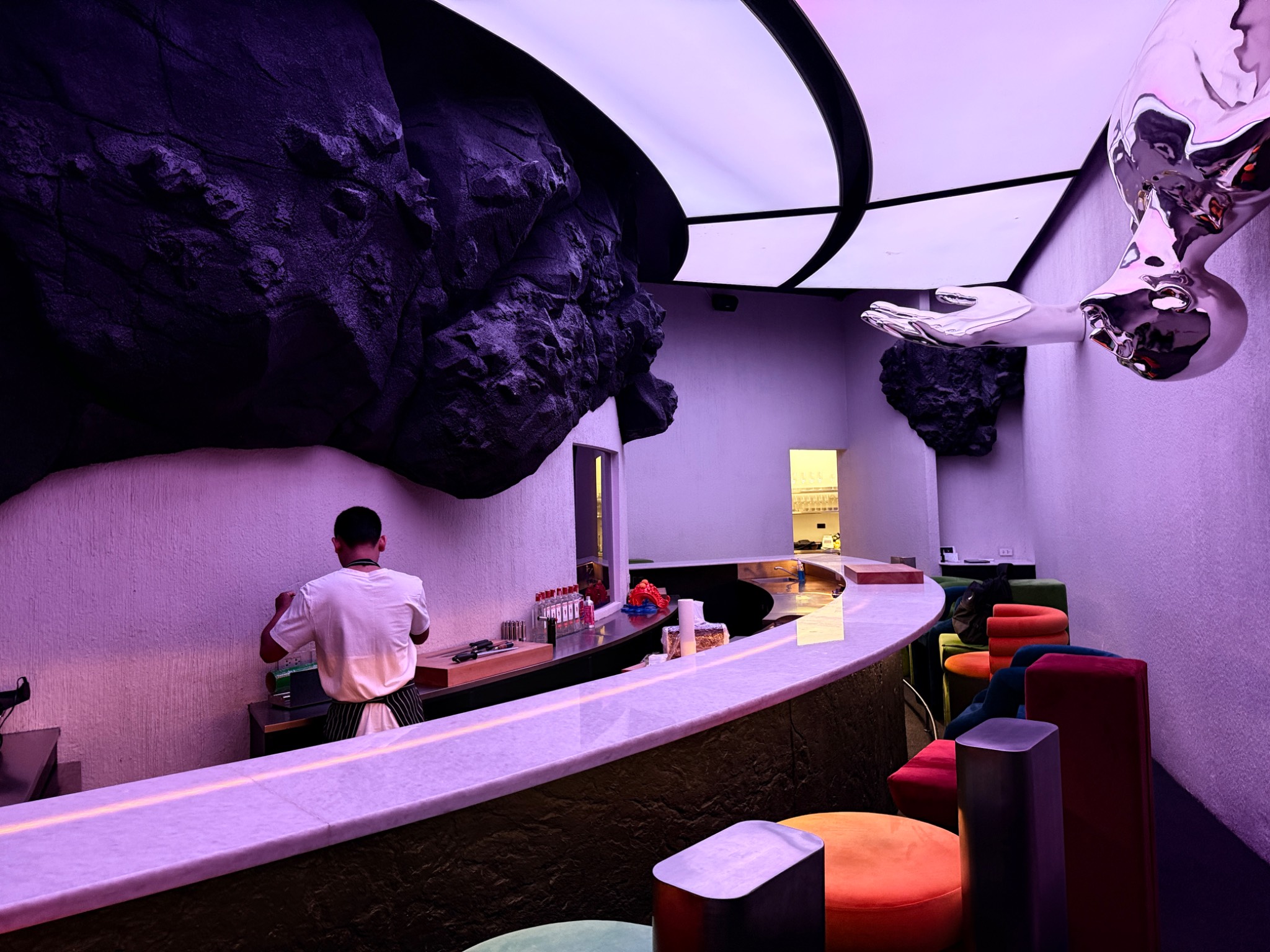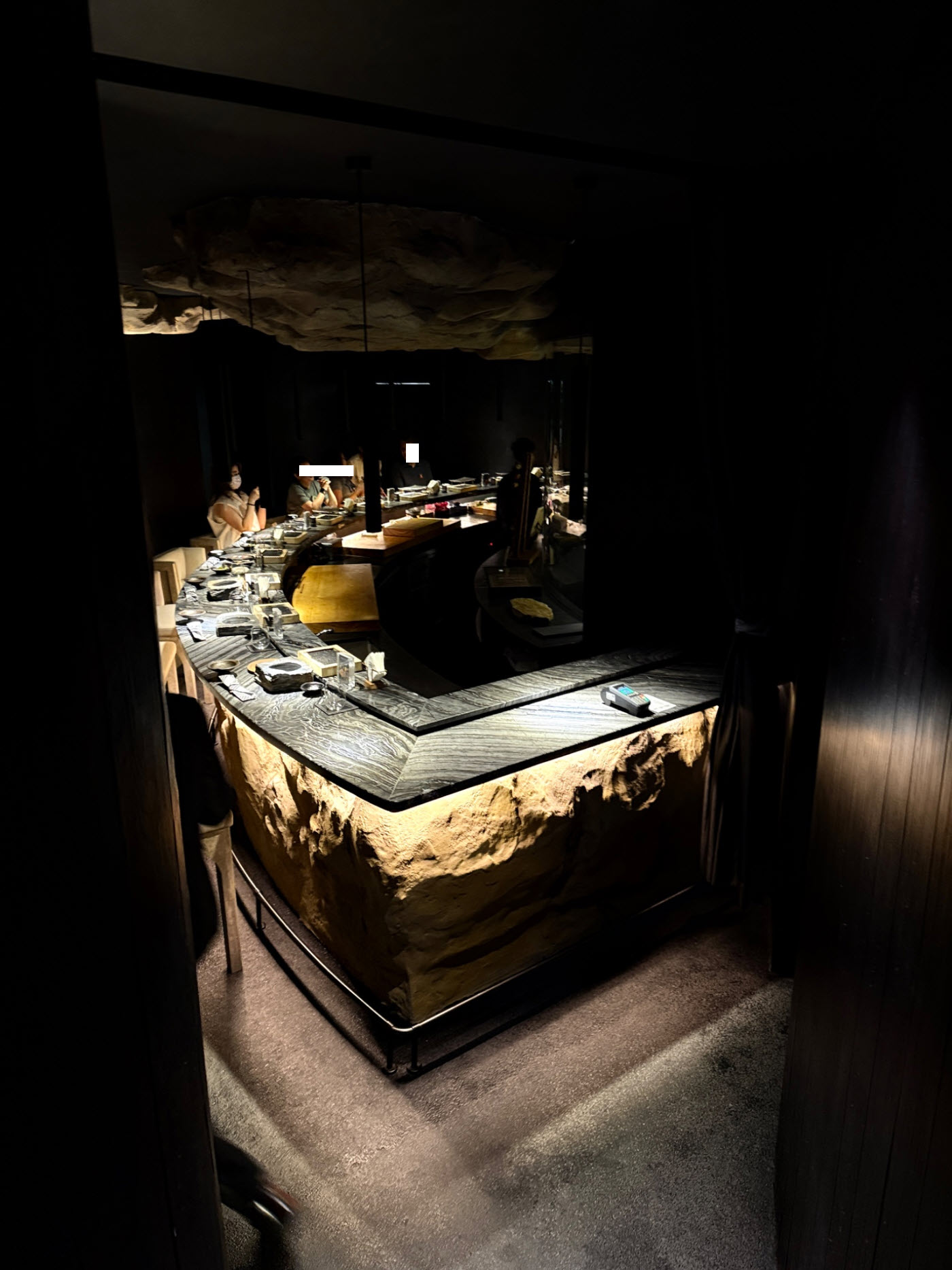 ตรงกลางเป็น โดมนั่งพักรอสวย แล้วมีทางแยกวนไปยังห้องอาหารสามห้องที่จัดเก้าอี้หน้าบาร์ แนวโอมากาเสะ รวมสามห้อง แยกตามแนวอาหาร