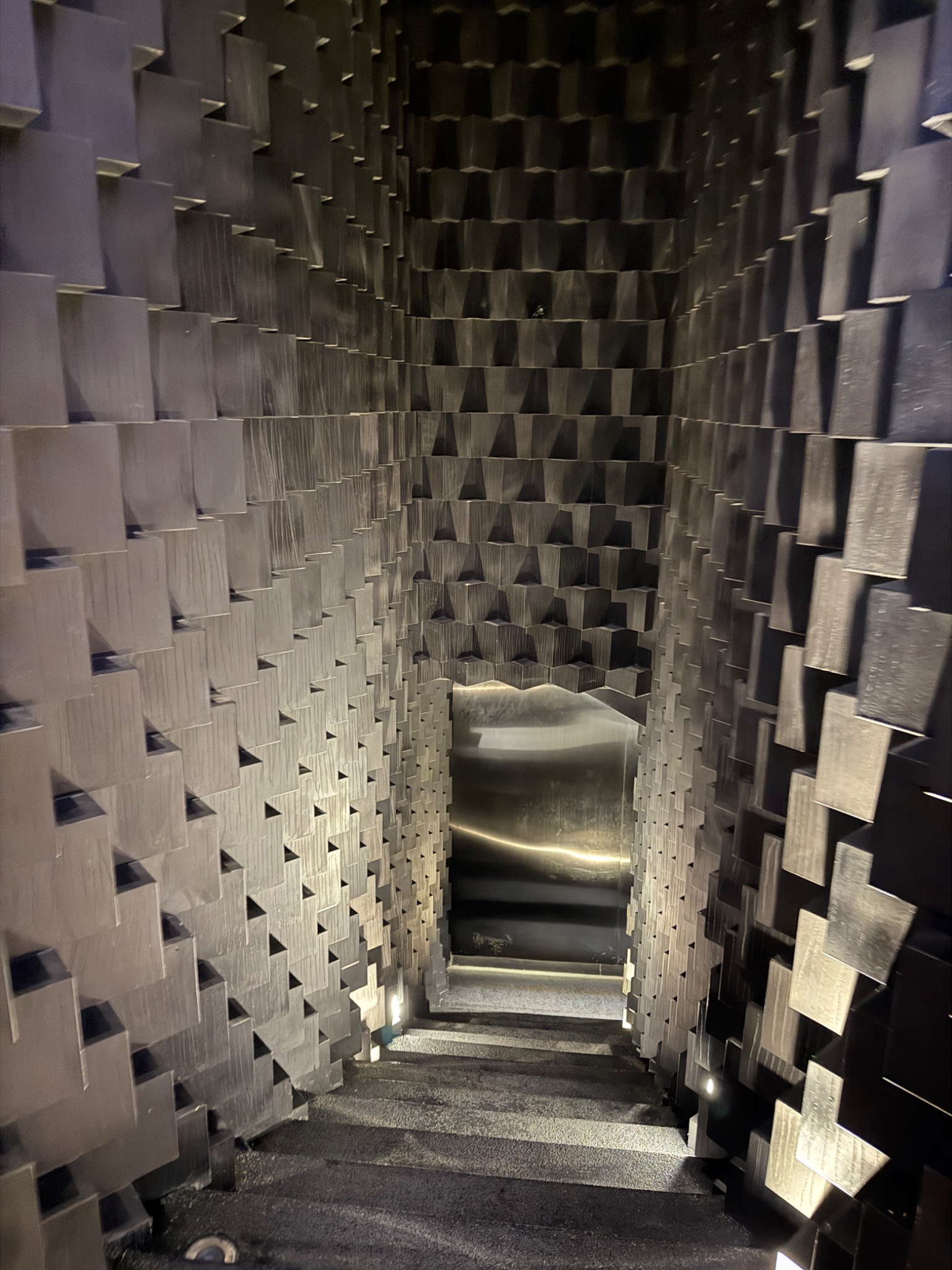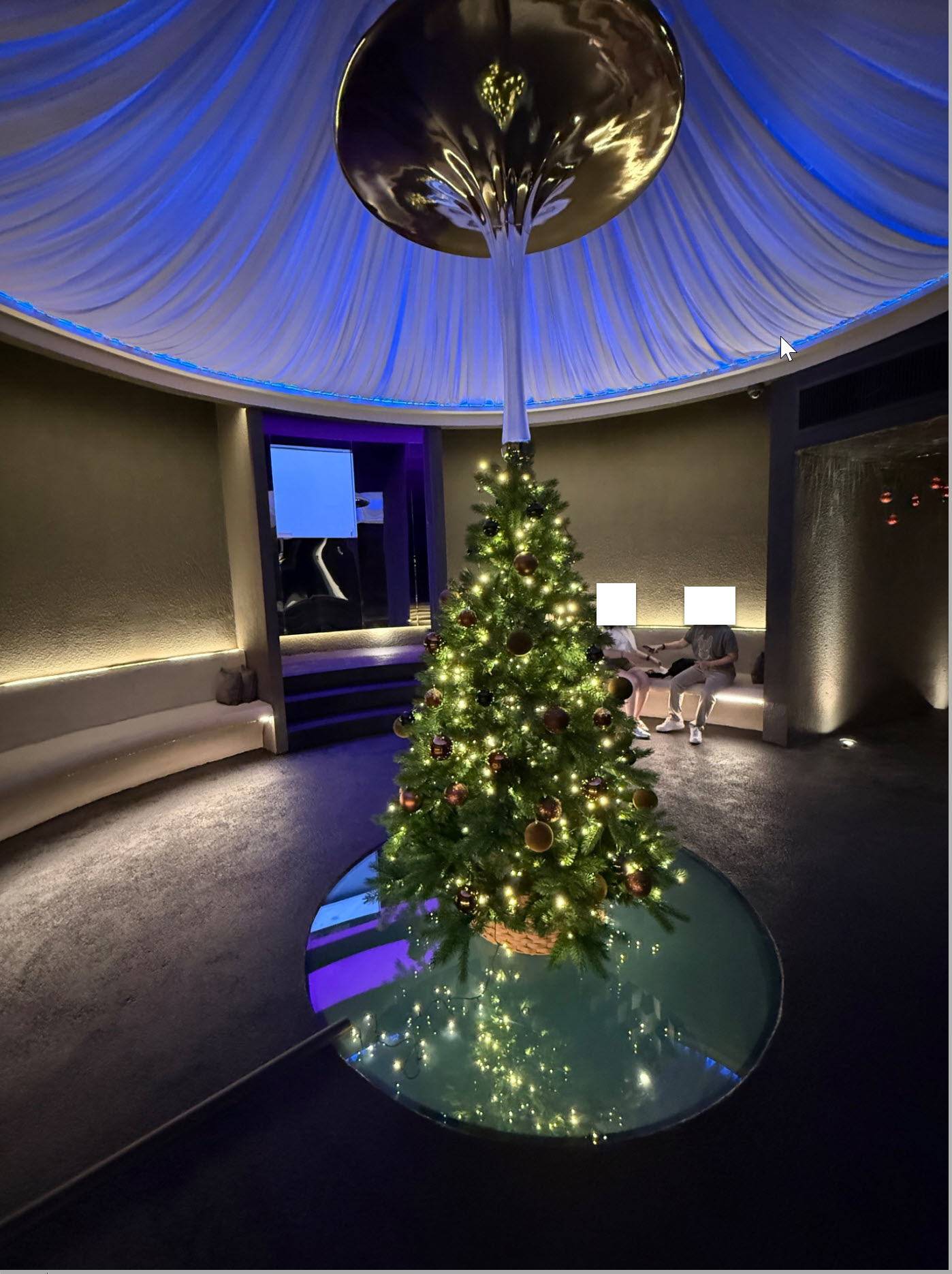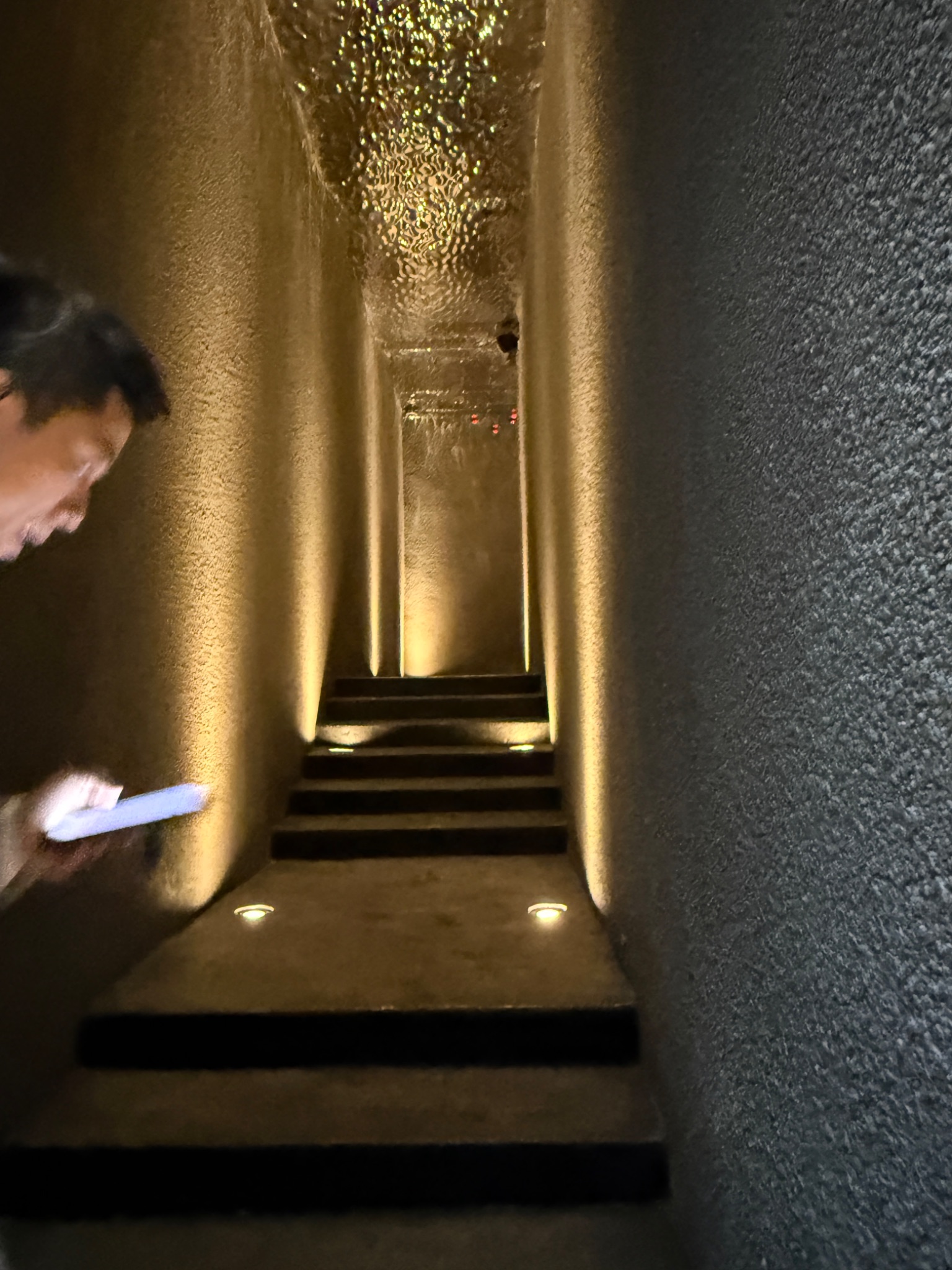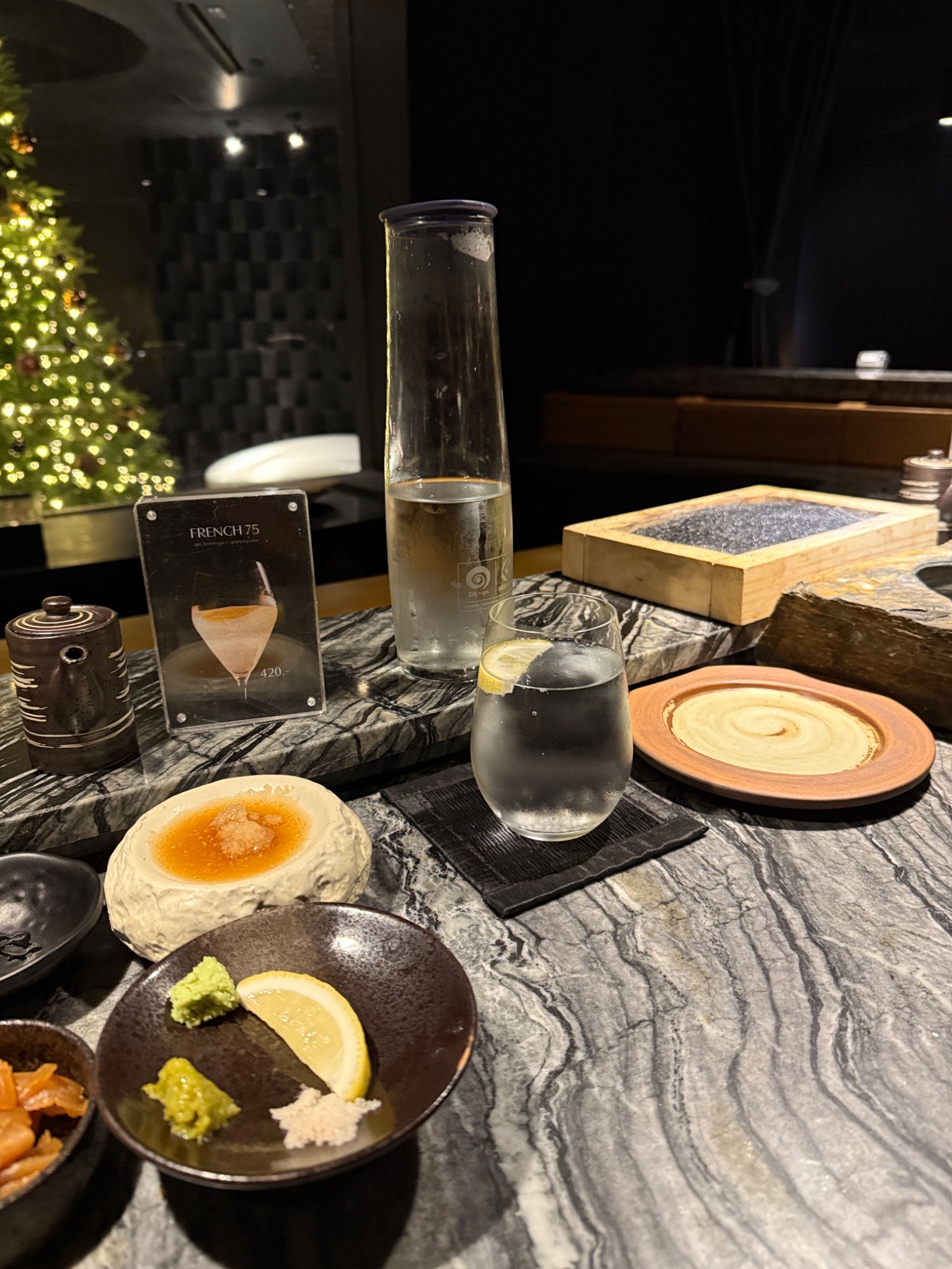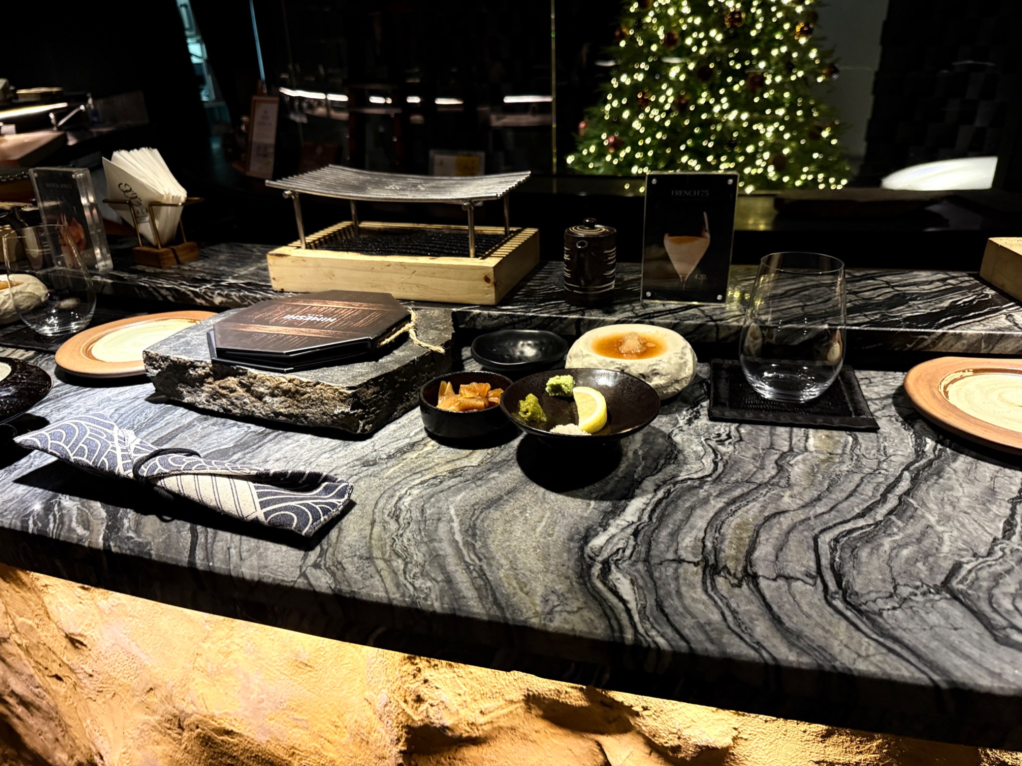 ตรงกลางเป็น โดมนั่งพักรอสวย แล้วมีทางแยกวนไปยังห้องอาหารสามห้องที่จัดเก้าอี้หน้าบาร์ แนวโอมากาเสะ รวมสามห้อง แยกตามแนวอาหาร