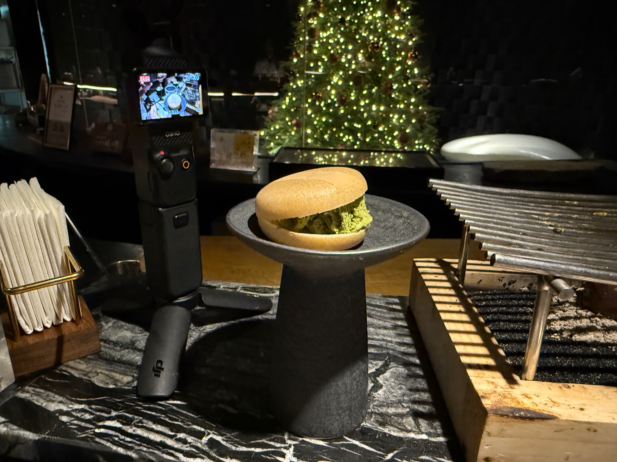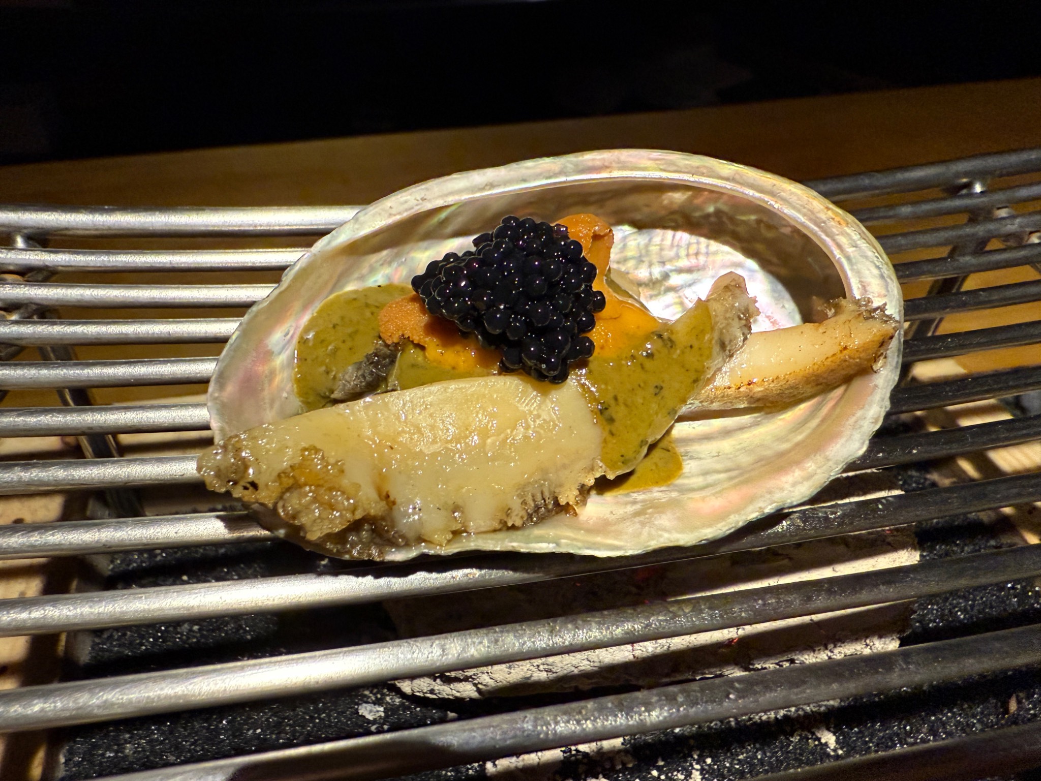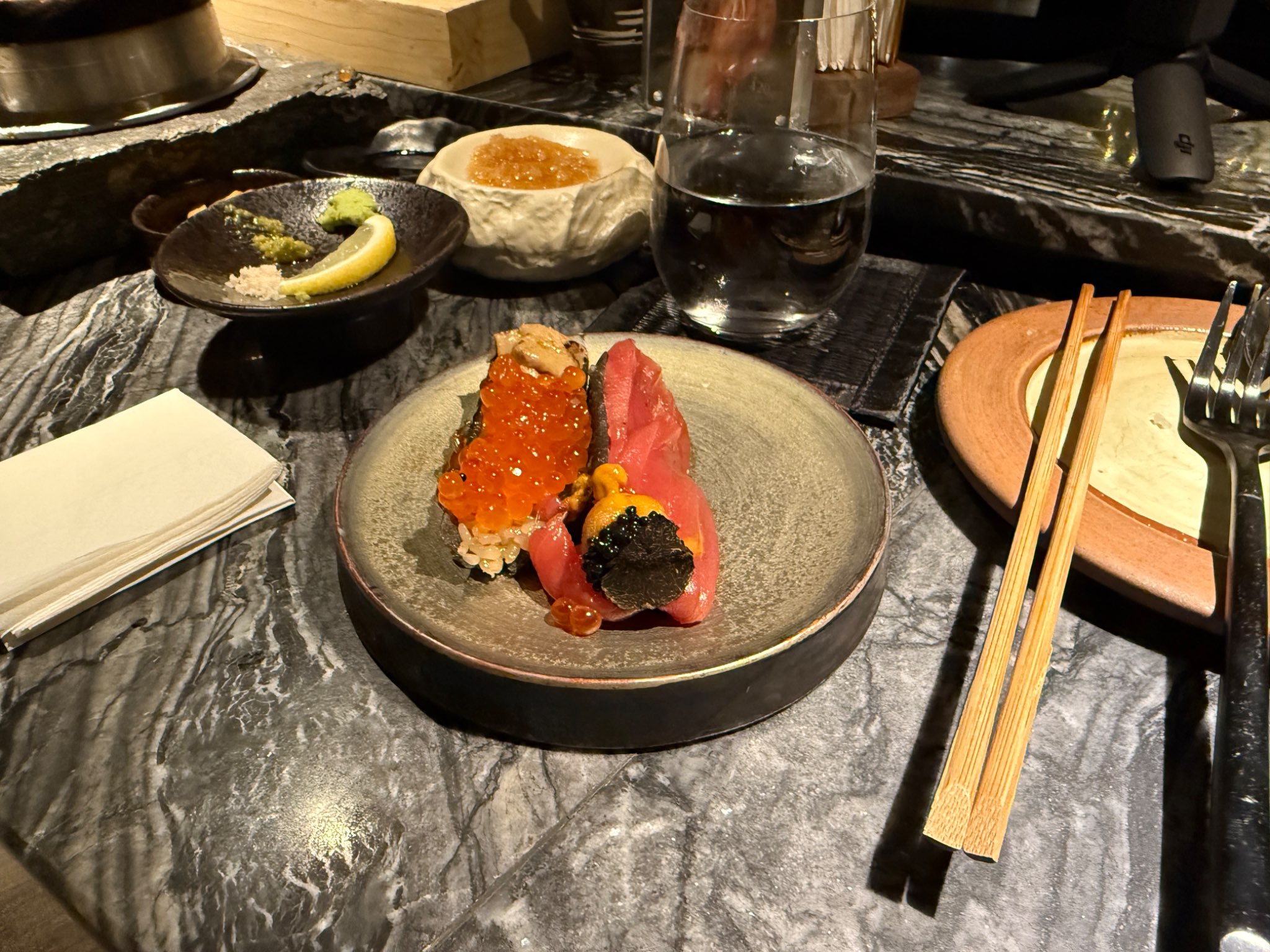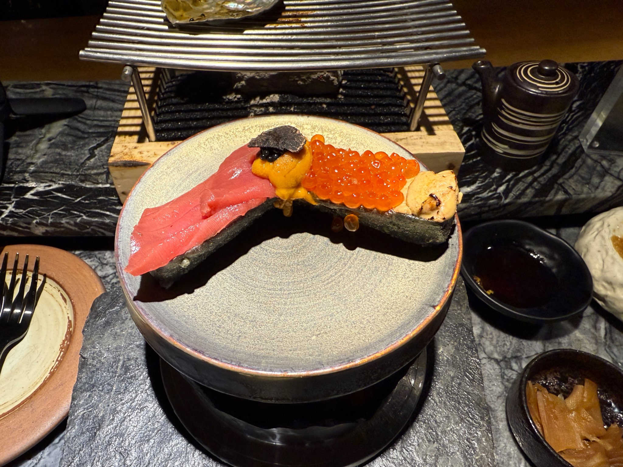 เป็นขนมปังแป้งชาโคล ท้อปด้วย chotuoro+ brafun uni + ฟรัวกราส์ +ikura + truffle