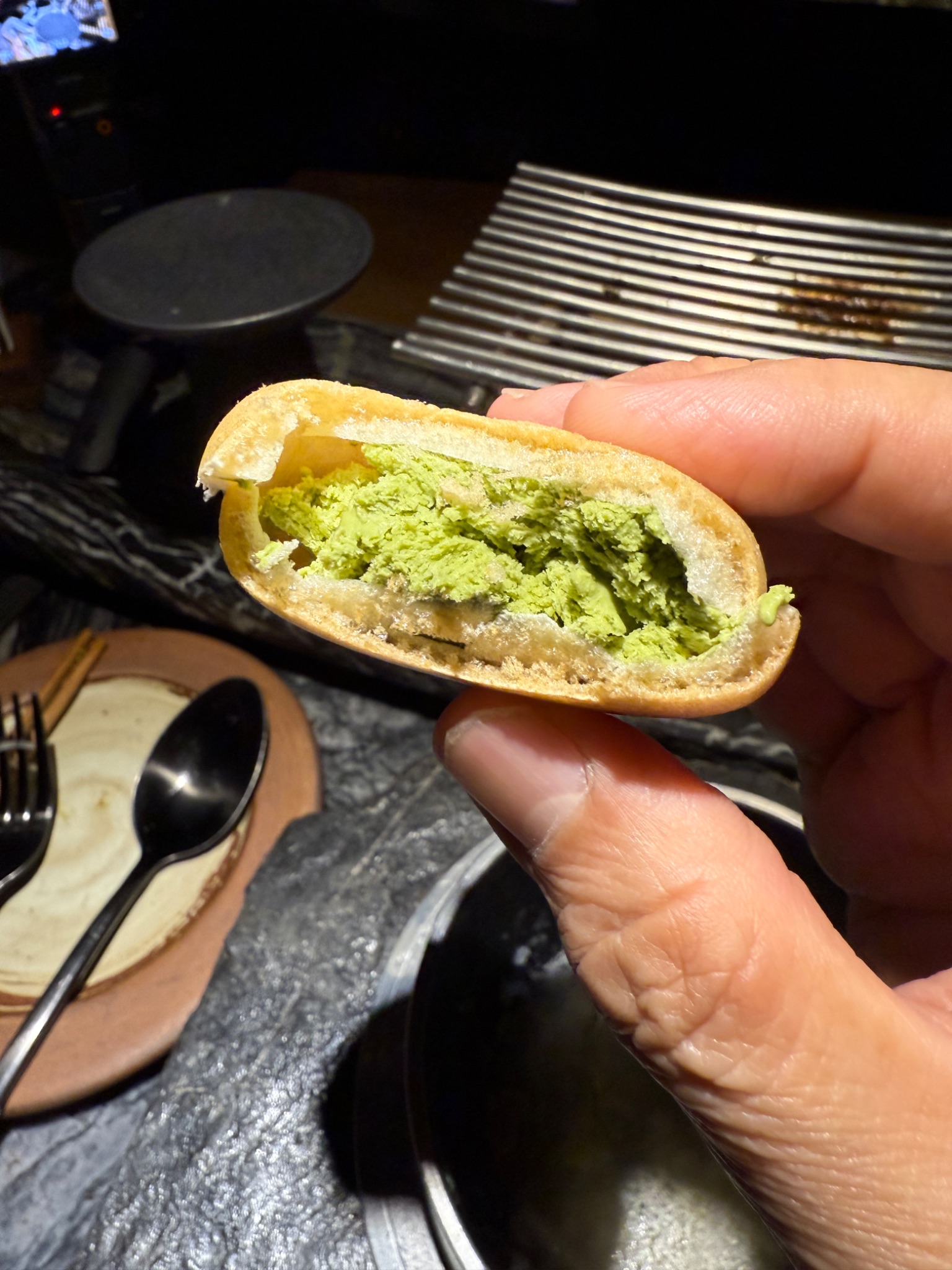 ไอสครัมชาเขียวประกบด้วยแป้งโมจิอบกรอบคล้ายข้าวเกรียบว่าว