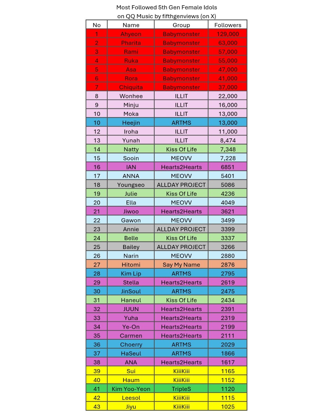 เมมเบอร์ทั้ง 7 คนของ BABYMONSTER ครองทั้ง 7 อันดับแรกของศิลปินหญิงเคป๊อปเจน 5 ที่มียอดผู้ติดตามสูงสุดบน QQ Music ของประเทศจีน