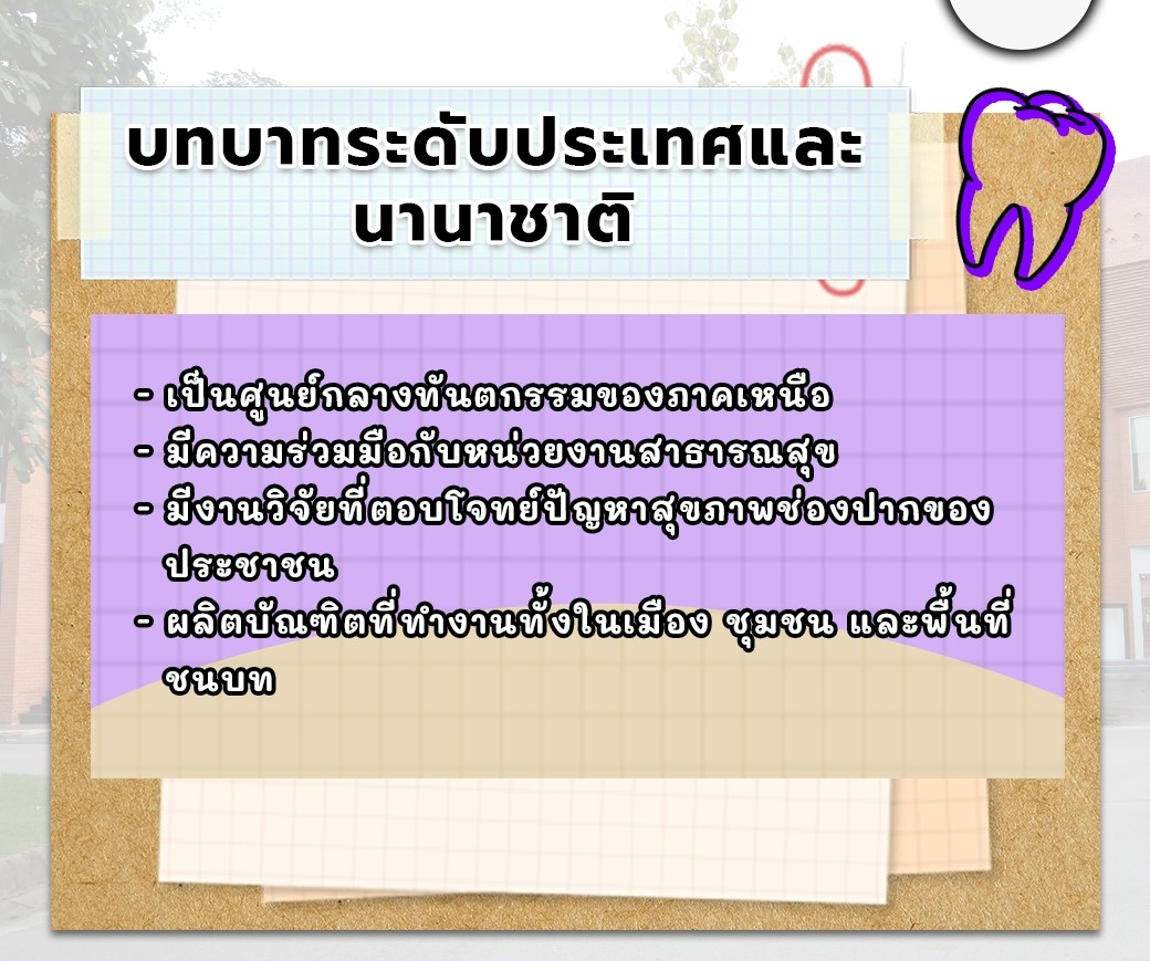 📌 บทบาทที่น่าภาคภูมิใจ วันนี้ ทันตะ มช. ไม่ได้เป็นเพียงสถานศึกษา แต่คือศูนย์กลาง (Hub) ทันตกรรมของภาคเหนือที่มีความร่วมมือกับหน่วยงานสาธารณสุขทั่วประเทศ เพื่อผลิตบัณฑิตที่ทำงานได้จริงทั้งในเมืองและชนบท