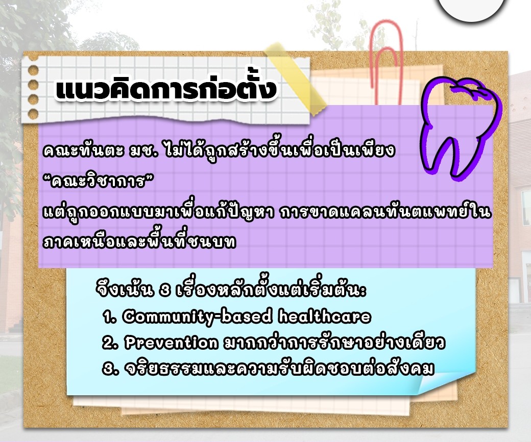 📌 จุดเริ่มต้นที่มีไว้เพื่อ "ส่วนรวม" ย้อนกลับไปปี พ.ศ. 2520 คณะนี้ถูกสร้างขึ้นเพื่อแก้ปัญหาการขาดแคลนทันตแพทย์ในพื้นที่ห่างไกล โดยยึดหลัก 3 ประการ: