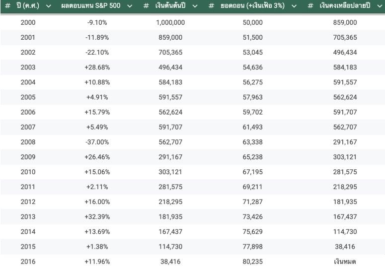ถ้าคุณเกษียณเมื่อตอนปี 2000 แล้วออมเงิน 1 ล้านเหรียญใน S&P500 ถอนปีละ 50,000 เงินคุณจะหายหมดในปี 2016