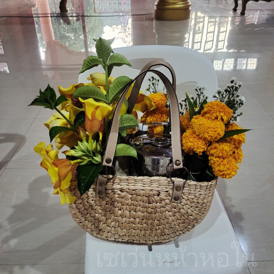 ดอกไม้บูชาพระซื้มาจากตลาด แล้วก็ตัดเอาดอกไม้ที่บ้านมาเพิ่มครับ