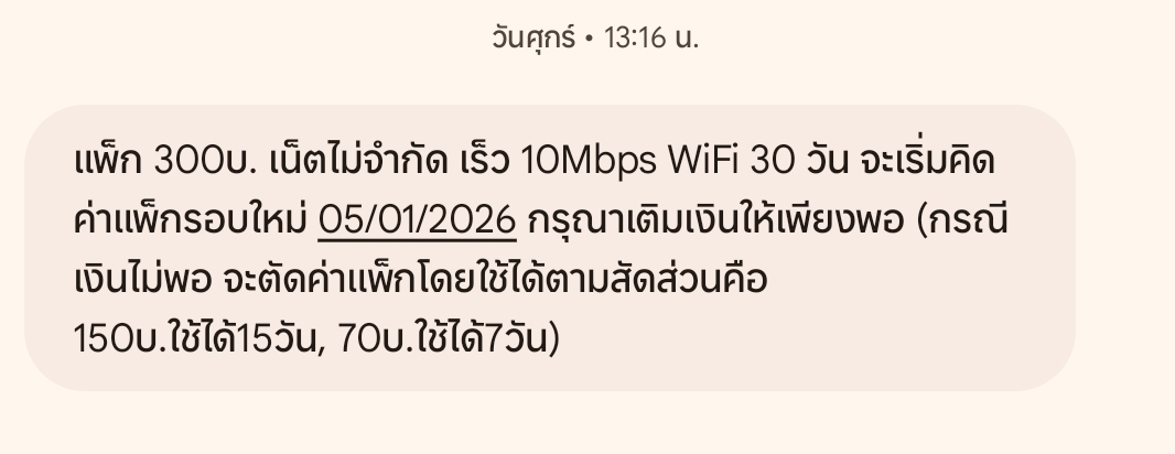 เมื่อวันที่03/01/2569 เน็ตเราหมดพอดีแล้วทางแพ็กเกจให้เราเติมเงินให้ครบภายในวันที่10/01/2569 ภายในเวลา 20:06 พอดีเติมเงิน 150 บาทไว้ครบแล้วแต่ระบบไม่ได้หักเงินต่ออายุอัตโนมัติ (แพ็กเน็ต 150บ. 4Mbps 1