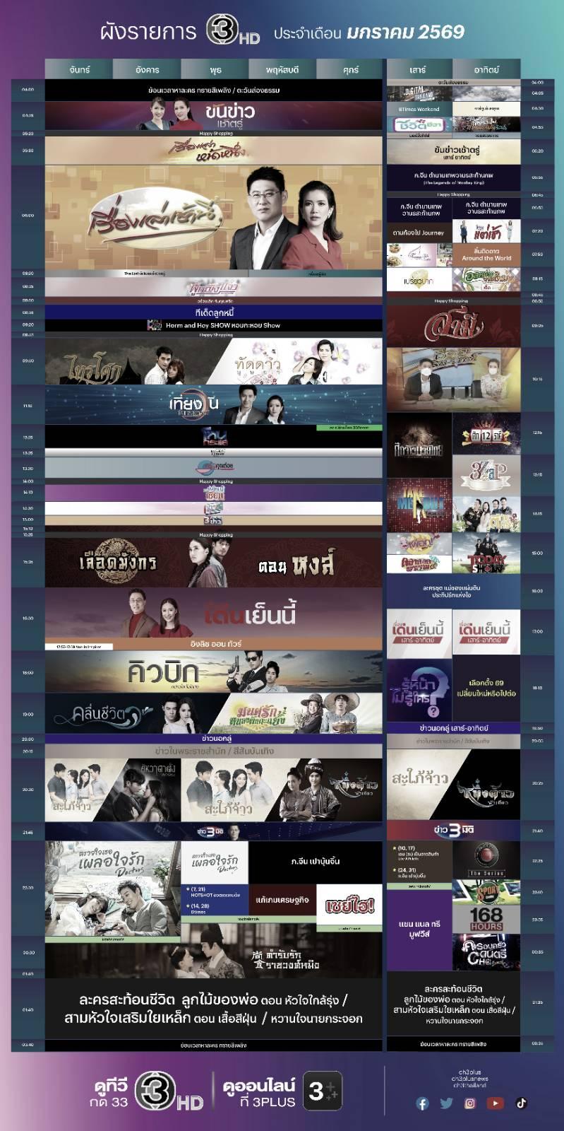 📌🔴 ผังรายการช่อง 3HD เดือนมกราคม 2569 (ฉบับแก้ไข) 📌🔴 รีรันมาราธอน ละคร "หนึ่งด้าวฟ้าเดียว" / "มนต์รักหนองผักกะแยง"