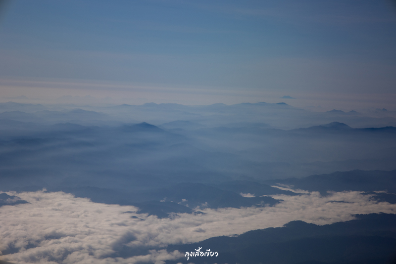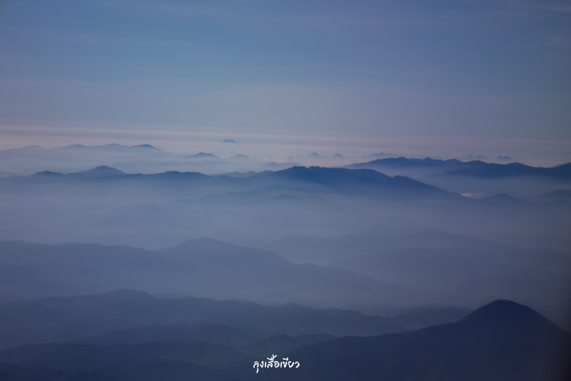 จากทะเลหมอกเป็นก้อน ๆ กลายเป็นสายหมอก (หรือฝุ่น PM 2.5 ก็ไม่รู้) บาง ๆ คลอเคลียอยู่บริเวณทิวเขา สวยงามไปอีกแบบครับ