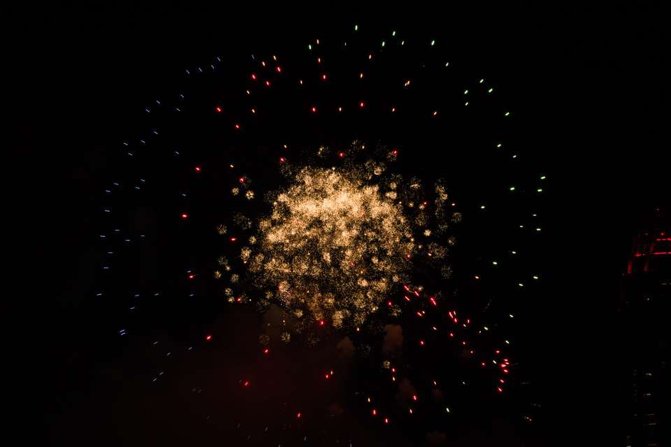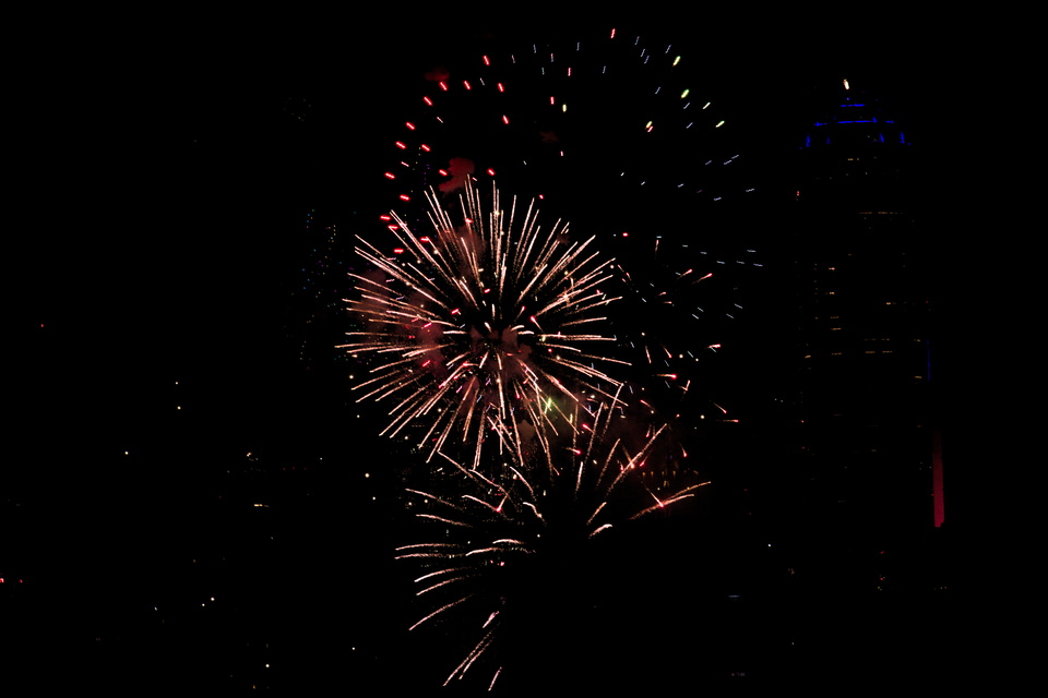 ปีที่แล้วถ่ายพลุ ปีนี้ก็ถ่ายพลุอีก การถ่ายพลุยากพอตัว แมนนวลโฟกัส มือต้องไวเสี้ยววินาที เล็งว่าจะถ่ายตอนพลุเพิ่งแตกตัวหรือตอนพลุกระจายทั่วท้องฟ้าแล้ว แต่เพราะมือไวทำให้ภาพเสียเพราะมือสั่นไปหลายภาพ ตั้งเวลาชัตเตอร์เร็วก็ไม่ได้แสงน้อย ตั้งรูรับแสงกว้างก็ไม่ได้พลุกระจายทั่วฟ้าเดี๋ยวไม่ชัด เน้นกดชัตเตอร์รัว ๆ หวังว่าจะมีภาพดีปนบ้าง