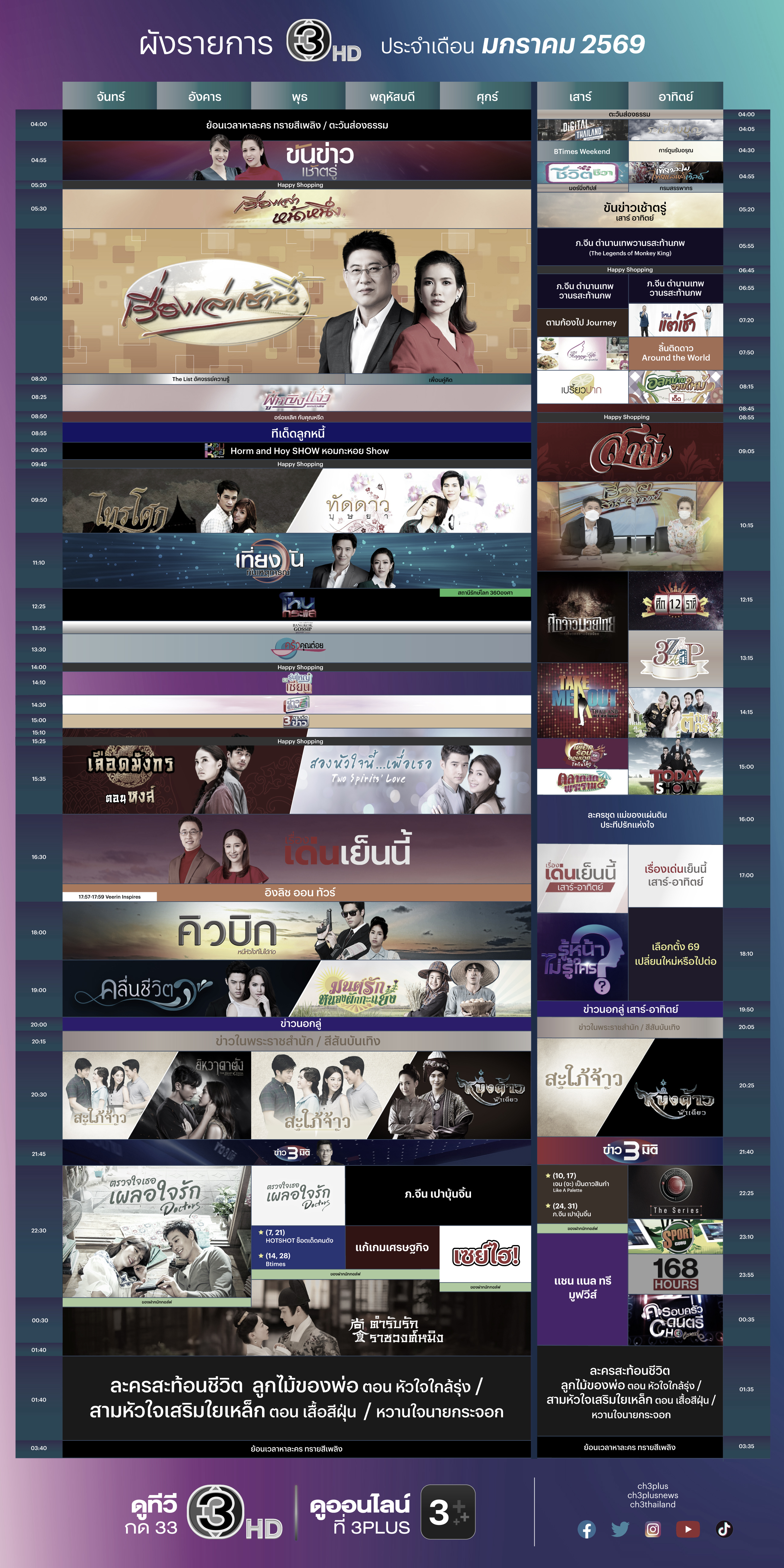 📌🔴 ผังรายการช่อง 3HD ประจำเดือน มกราคม 2569 📌🔴