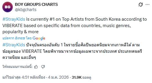 🔥 Stray Kids แรงต่อเนื่องจากปี 2025 สู่ 2026! ปัจจุบันครองอันดับ 1 ในรายชื่อศิลปินยอดนิยมจากเกาหลีใต้ตามข้อมูล VIBERATE