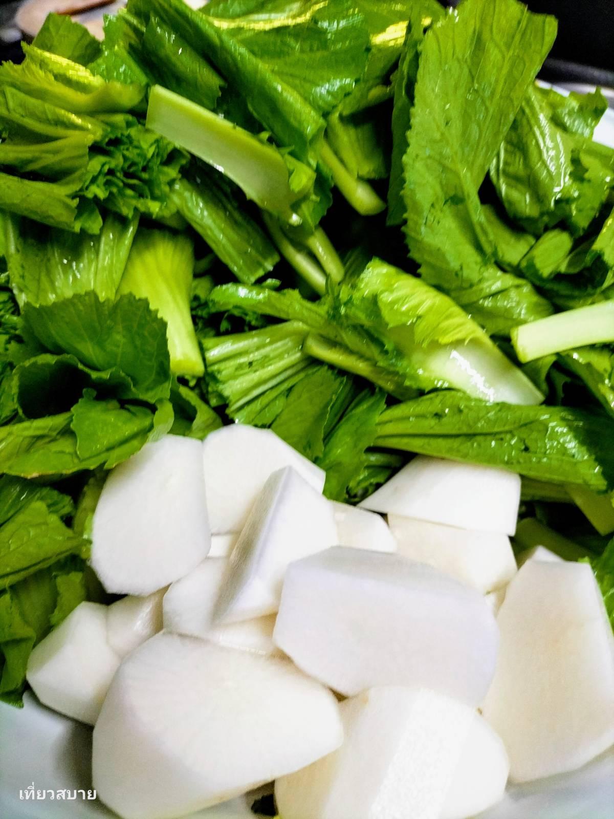 2. หัวไชเท้า, ผักกาดเขียวปลี ล้างทำความสะอาดหั่นให้พอดีคำ