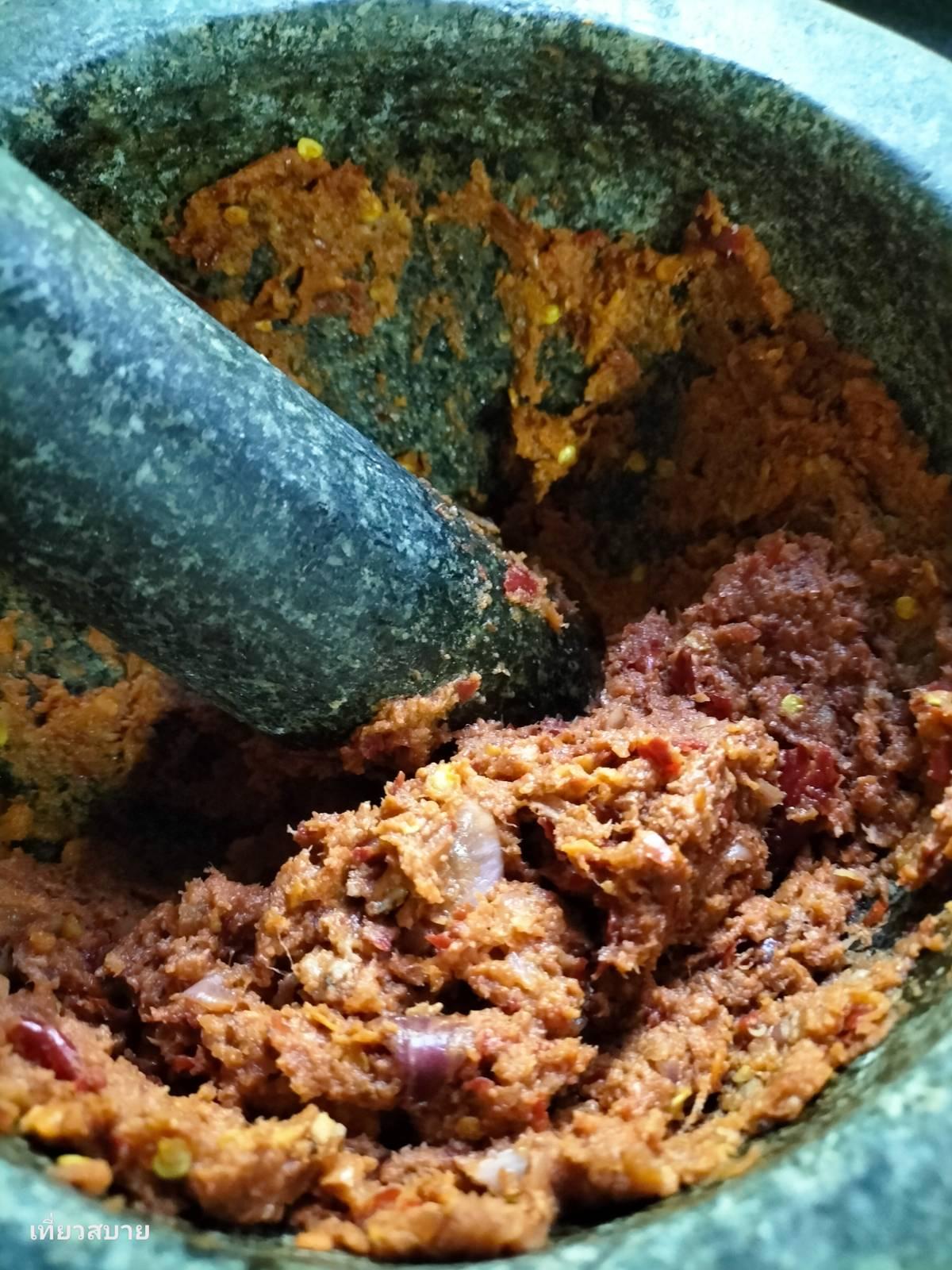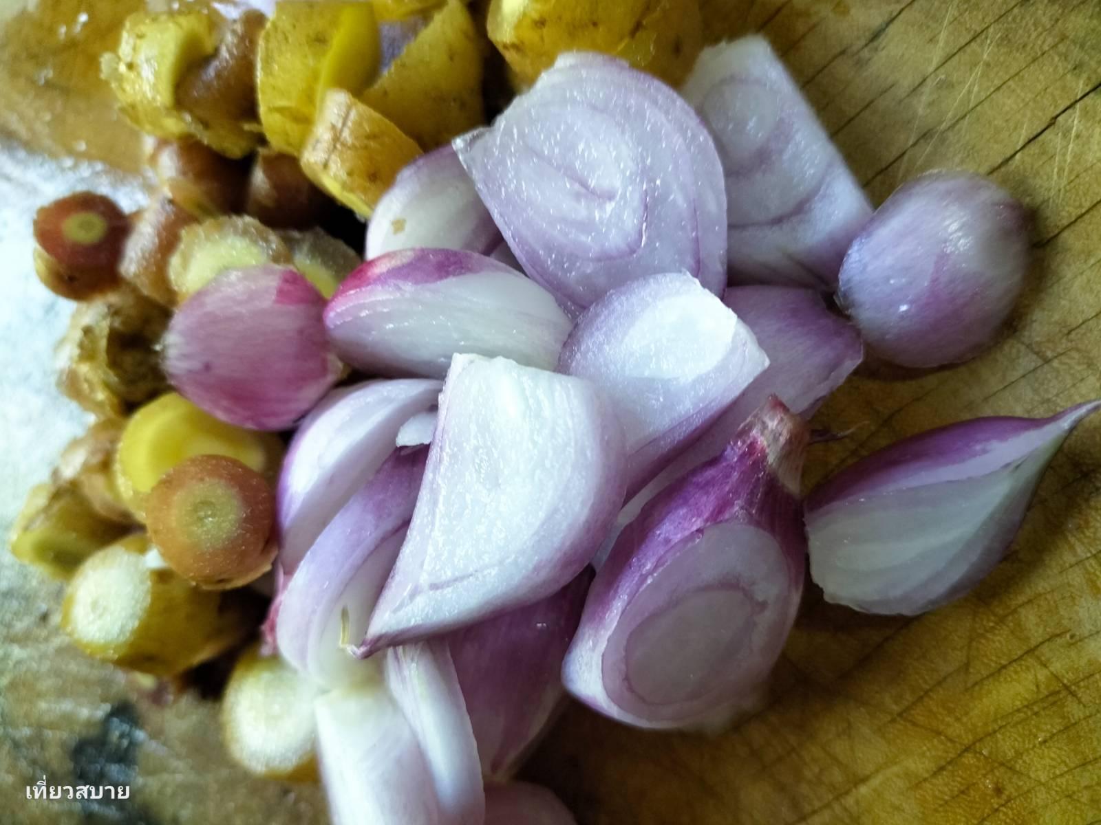 1. เริ่มจากโขลกหอมแดง พริกขี้หนูแห้ง กระชายซอย และกะปิเล็กน้อย (กระชายใส่เยอะหน่อยช่วยดับคาวปลาได้ดีมาก) ให้ละเอียด