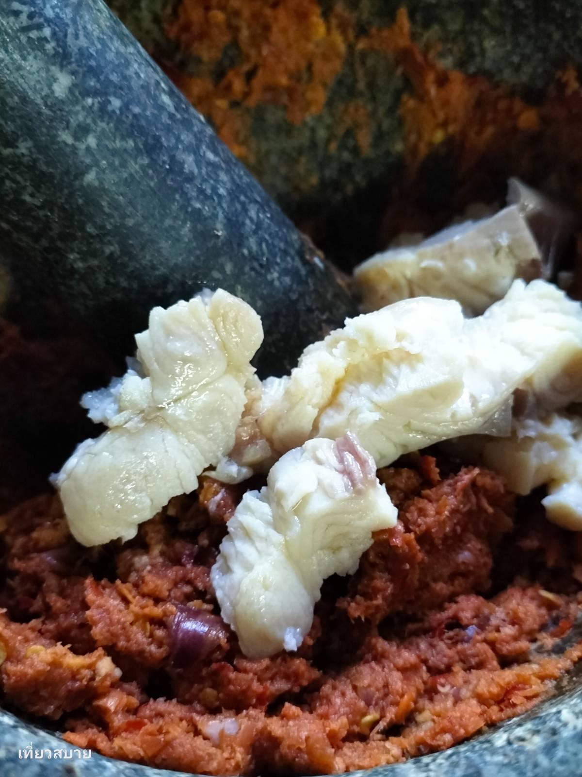 2. แบ่งเนื้อปลาสวายบางส่วนไปต้มให้สุก แล้วนำมาโขลกรวมกับพริกแกง ให้เป็นเนื้อเดียวกัน จนเนื้อปลาฟู วิธีนี้จะทำให้น้ำแกงเข้มข้น นัวมากขึ้นค่ะ