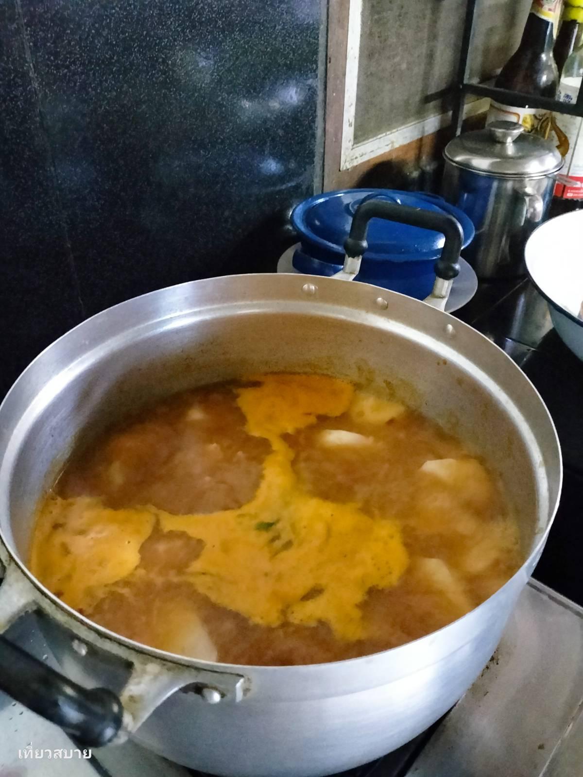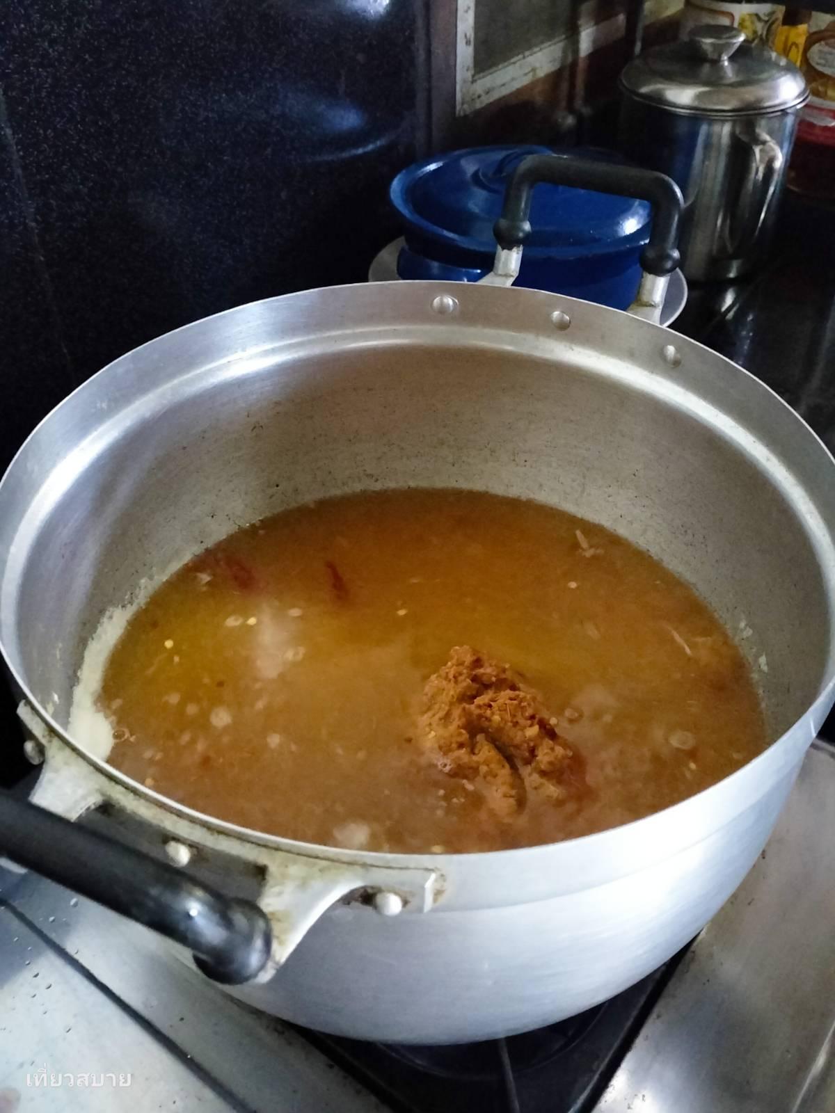 3. ตั้งน้ำให้เดือด (ใช้น้ำที่ต้มปลาก่อนหน้าก็ได้ค่ะ) ละลายพริกแกงที่โขลกไว้ลงไป