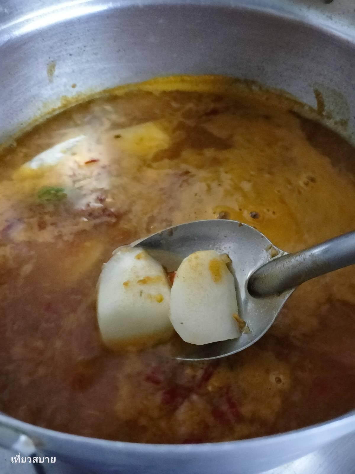 ปรุงรสด้วยน้ำมะขามเปียก น้ำปลาร้า น้ำตาลทรายเล็กน้อย เพื่อตัดรส ชิมให้ได้รสเปรี้ยวนำ เค็มตาม ใส่หัวไชเท้าลงไปต้มก่อนจนเริ่มสุก