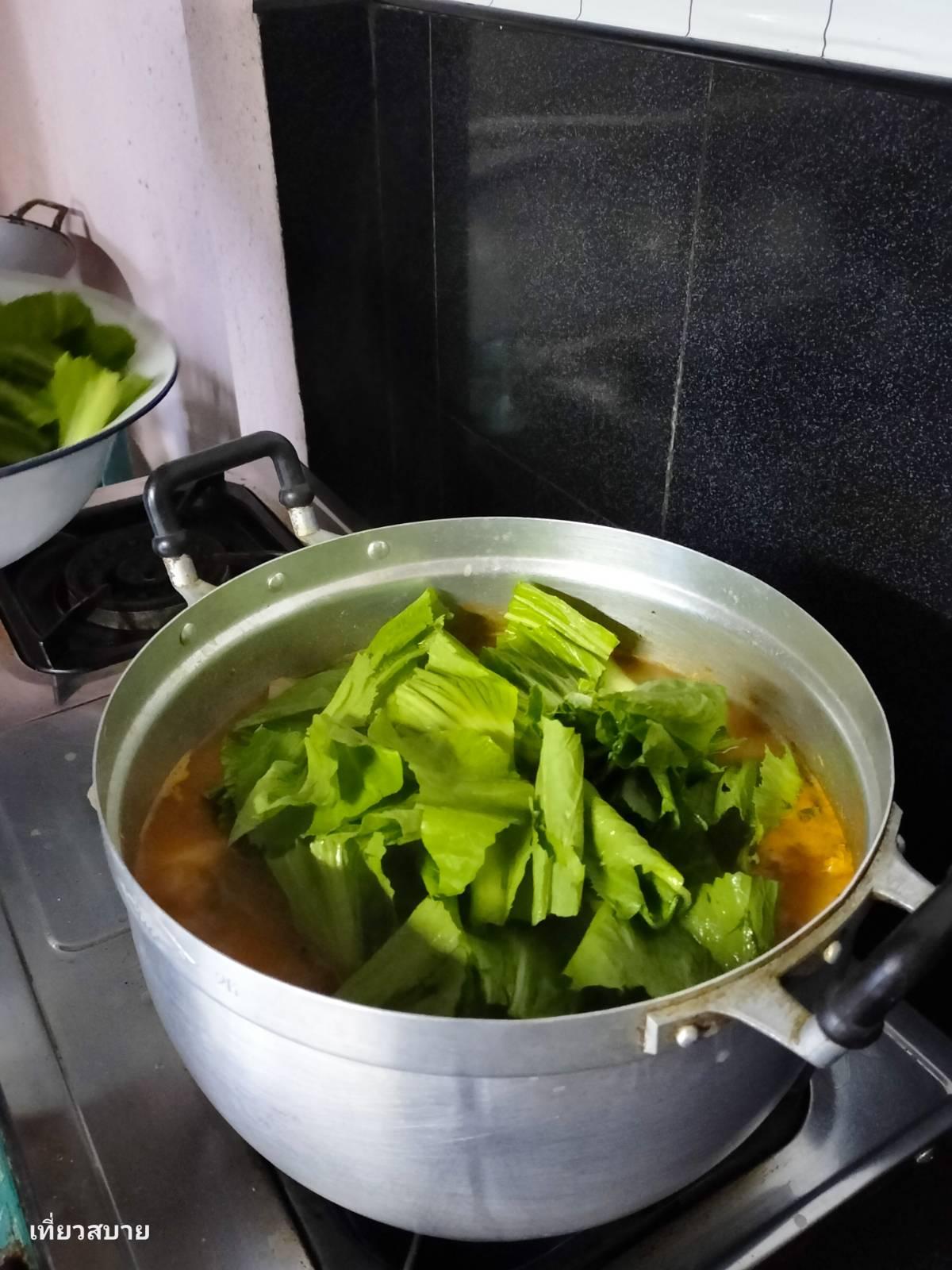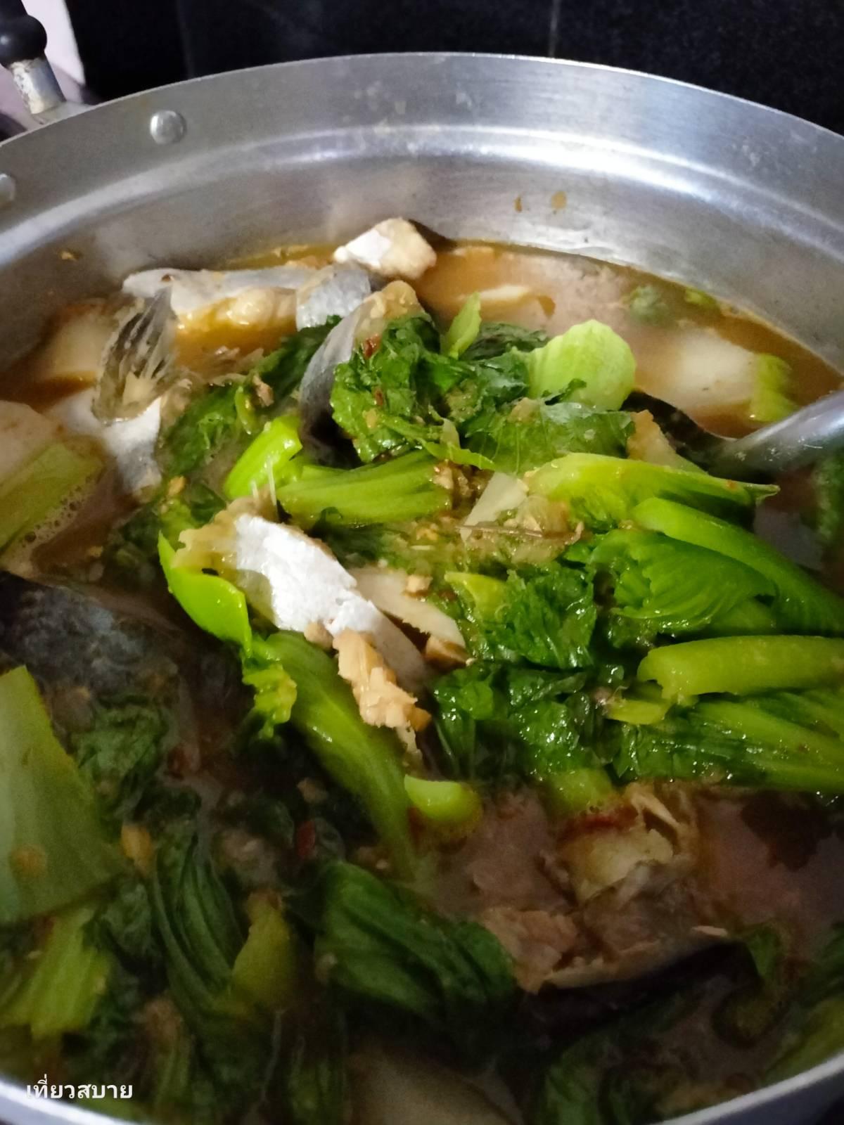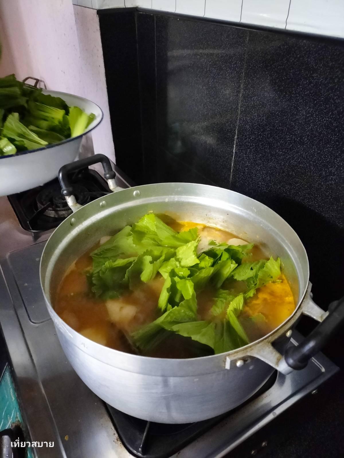 เร่งไฟให้น้ำแกงเดือดจัดๆ แล้วค่อยใส่ชิ้นปลาสวายลงไป พอปลาเริ่มสุก ใส่ผักกาดเขียวปลีลงไป รอให้น้ำเดือดอีกครั้ง ปิดไฟ ตักเสิร์ฟได้ค่ะ
