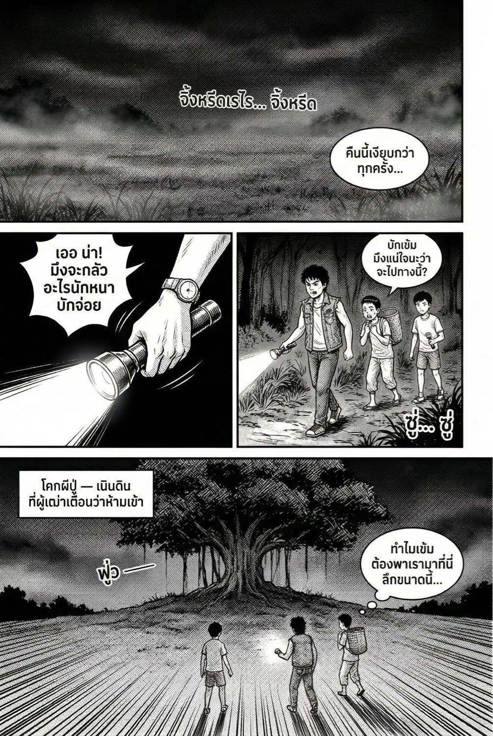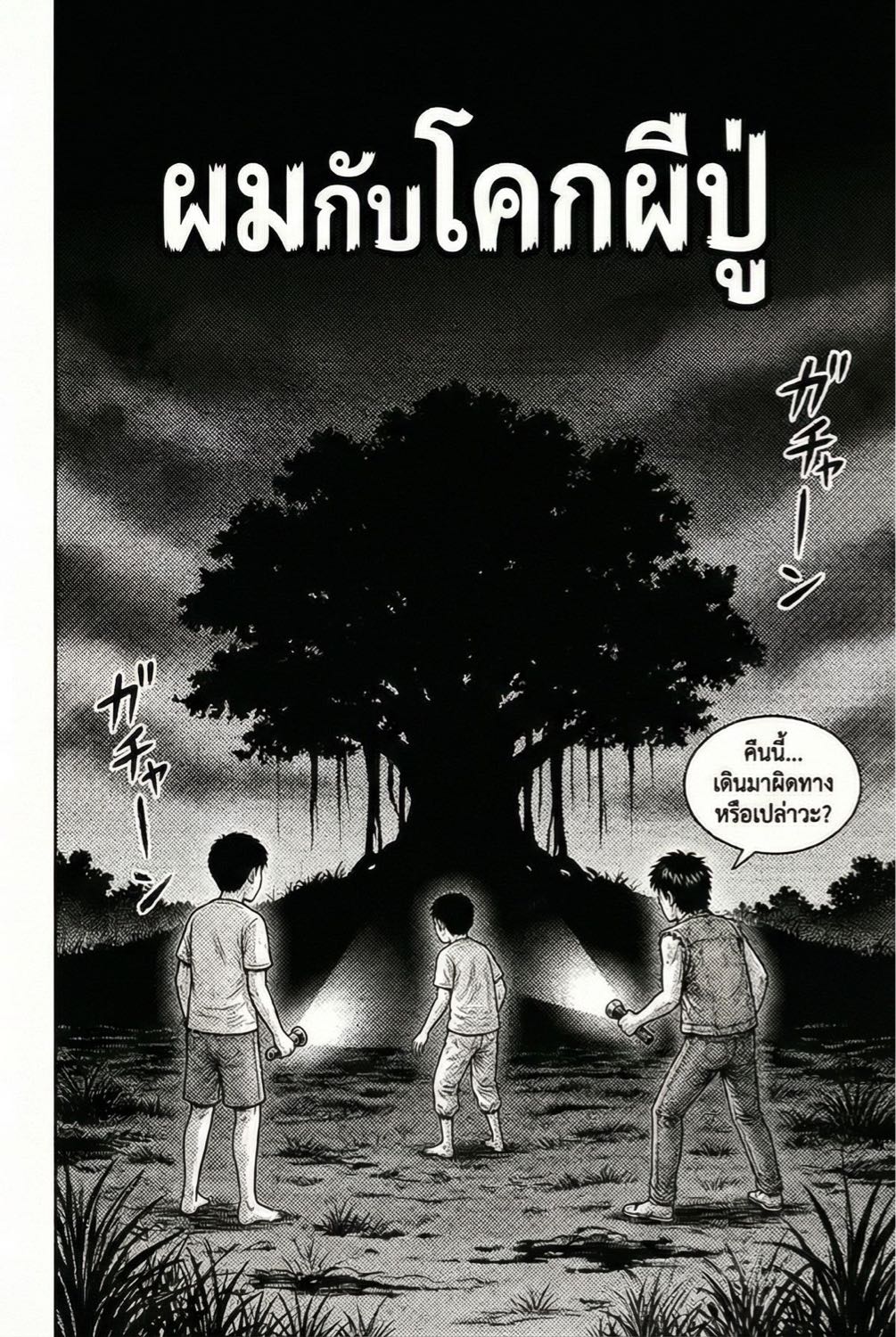 "บักเข้ม แน่ใจนะว่าจะไปทางนี้?" เสียงของ 'จ่อย' ไอ้หนุ่มร่างผอมแห้งถามขึ้นด้วยความหวาดหวั่น แสงไฟฉายในมือมันสั่นระริก