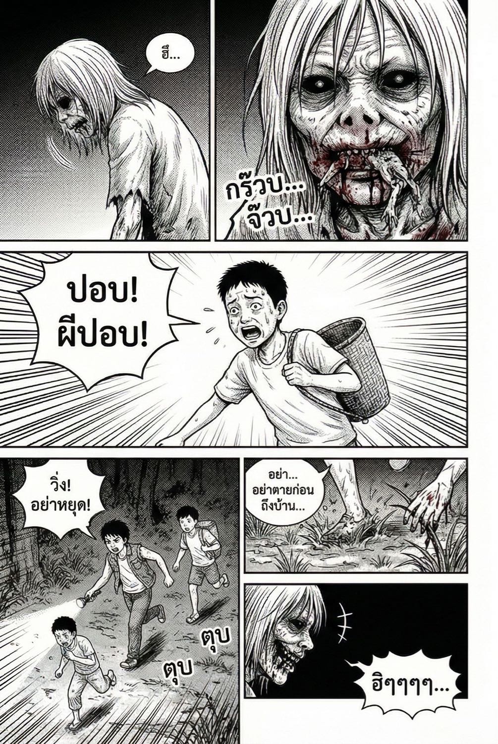 มันไม่ใช่ใบหน้าของมนุษย์! ผิวหนังเหี่ยวย่นดำคล้ำ ดวงตาลึกโบ๋สองข้างส่องประกายสีแดงฉานราวกับถ่านไฟคุ และที่ปาก... ปากที่ฉีกกว้างผิดรูปนั้นเต็มไปด้วยคราบเลือดสดๆ ที่ยังหยดติ๋งๆ ลงมาเปื้อนคาง ในมือที่ผอมเกร็งราวกับกิ่งไม้แห้ง กำลังถือซากกบตัวใหญ่อยู่ครึ่งตัว ส่วนหัวของกบหายไปแล้ว... อยู่ในปากของมันนั่นเอง!