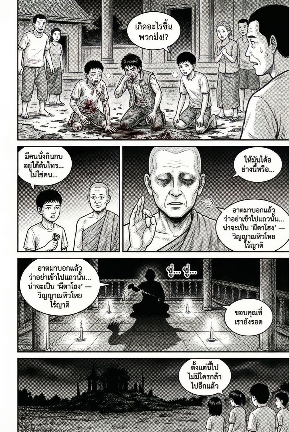 "อาตมาบอกแล้วว่าอย่าไปยุ่งแถวนั้น... ที่พวกเอ็งเจอหนะ น่าจะเป็น 'ผีตาโฮง' แกเคยเป็นคนหาของป่าแล้วไปตายอยู่แถวนั้น ไม่มีญาติพี่น้อง วิญญาณแกคงหิวโหย เลยออกมาหากินกบกินเขียดดิบๆ แบบนั้นแหละ ดีนะที่พวกเอ็งยังรอดมาได้"