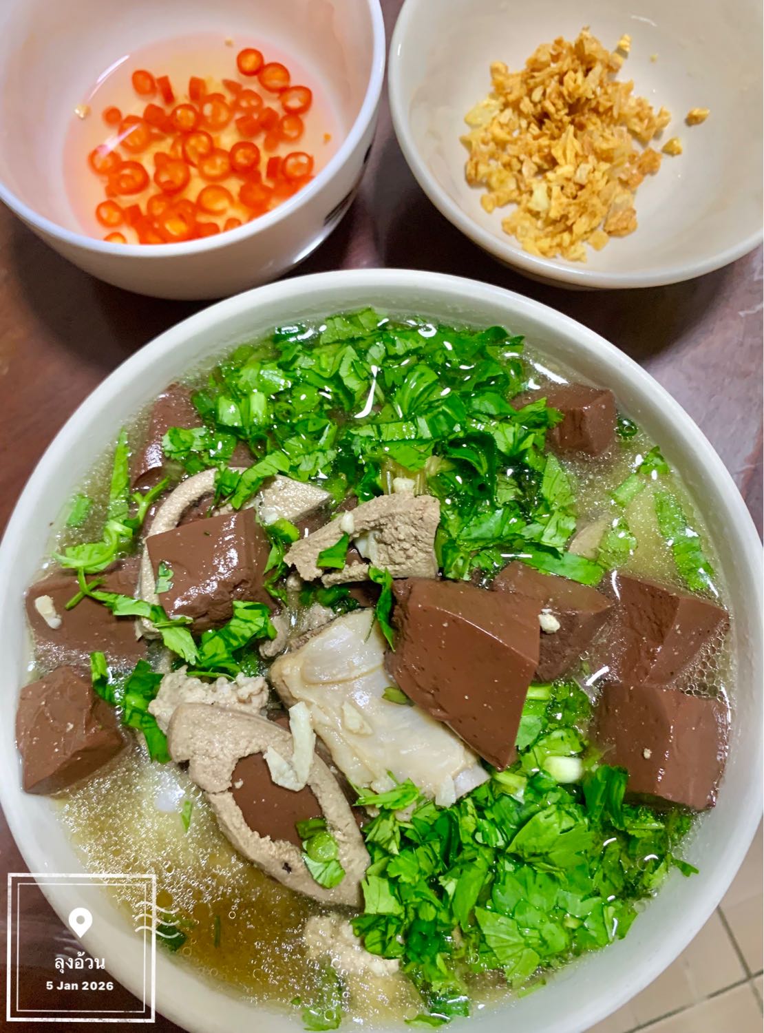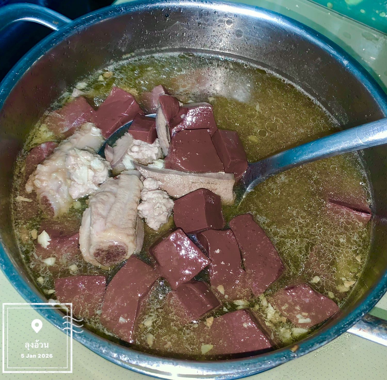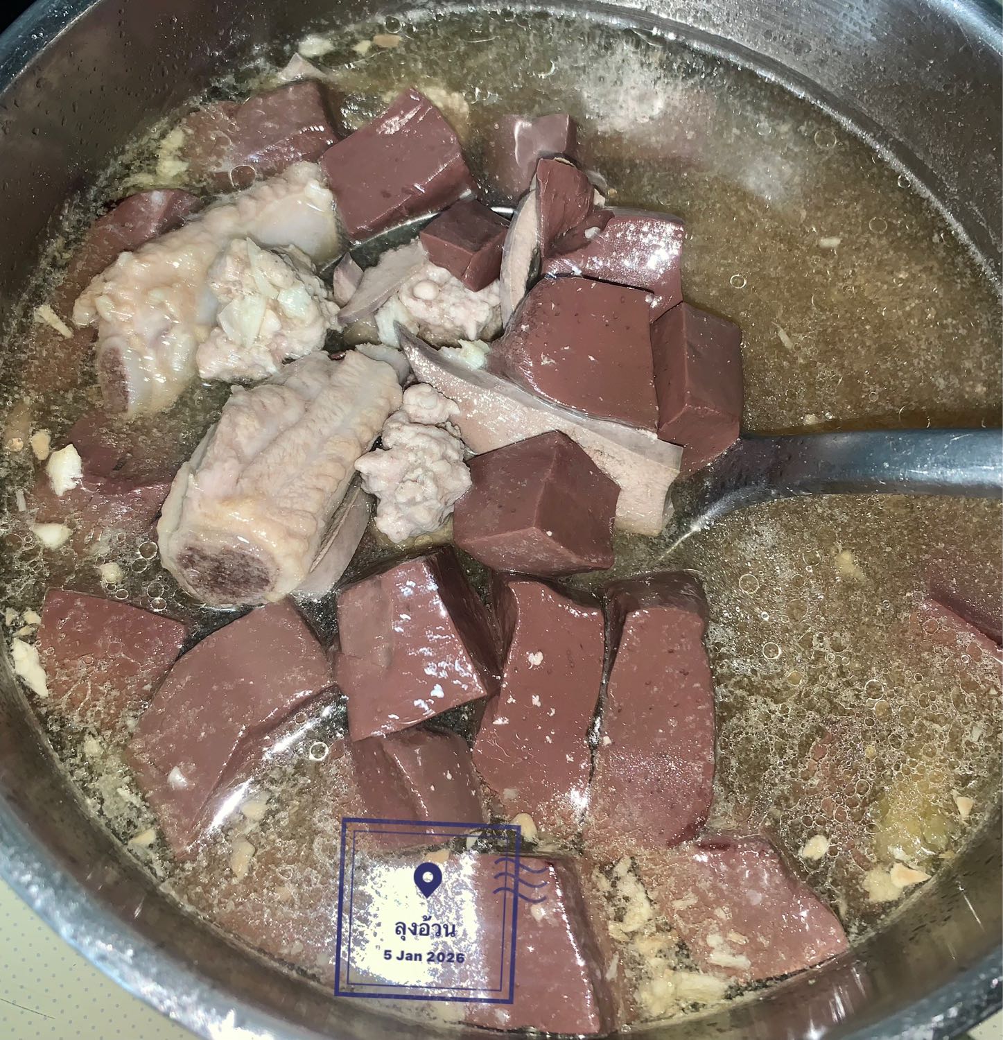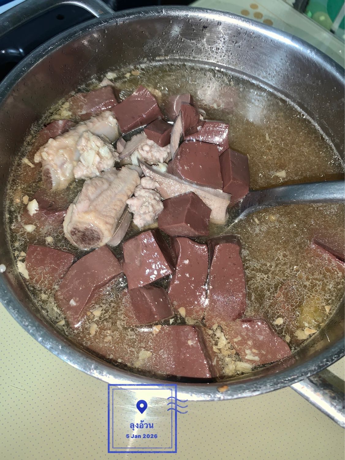 ต้มน้ำซุป ซี่โครงหมู ใส่ สามเกลอ ใส่ซีอิ๊วขาวเห็ดหอม ต้มซุป ใส่หมูปั้น ใส่ตับ เลือดหมูเอาไปลวกอีกรอบให้ฟูและหั่นเป็นท่อนสวยๆ