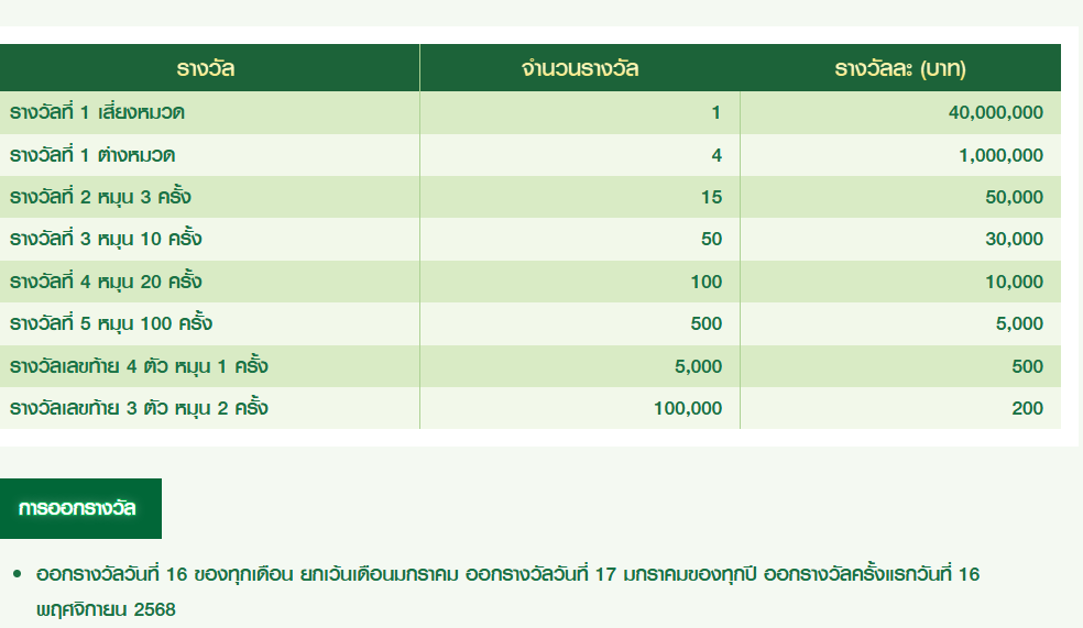 ออกรางวัลทุกวันที่ 16 ของเดือน   ยกเว้นเดือนมกราคม จะออกวันที่ 17