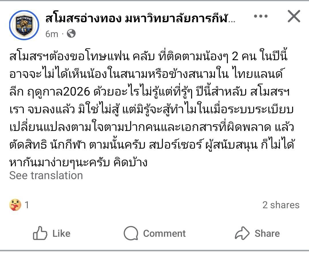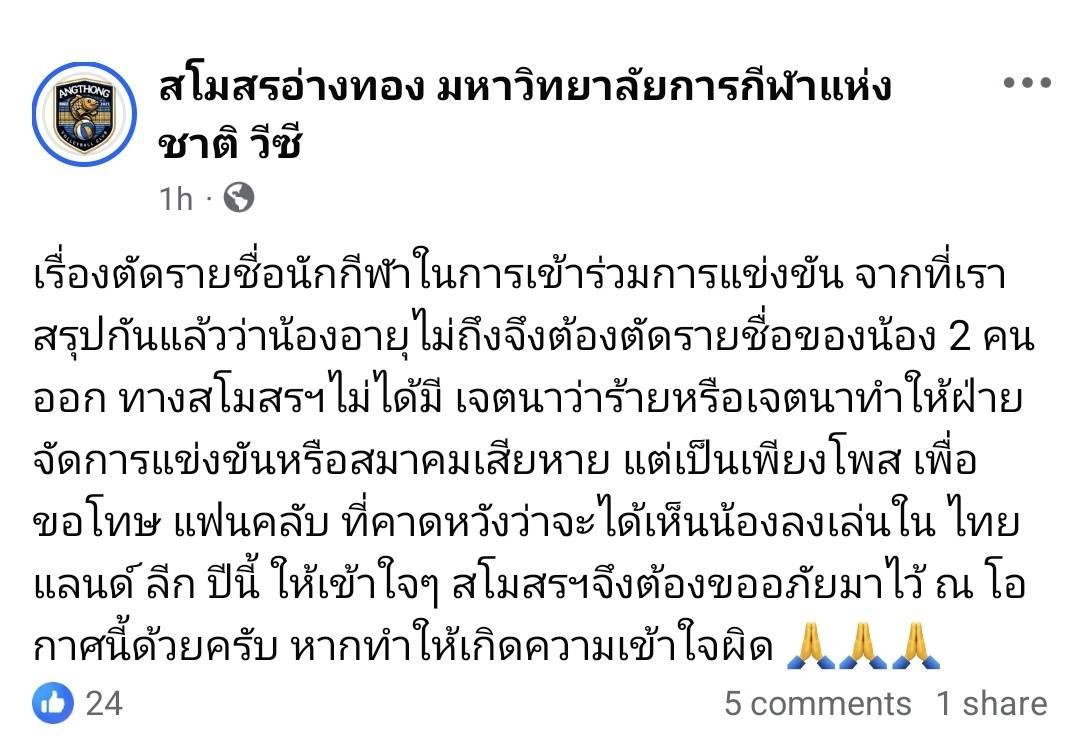 ไทยลีกยังไม่เริ่ม แต่ดราม่ามาแล้ว อ่างทองโพสว่ามีนักกีฬาถูกตัดสิทธิ