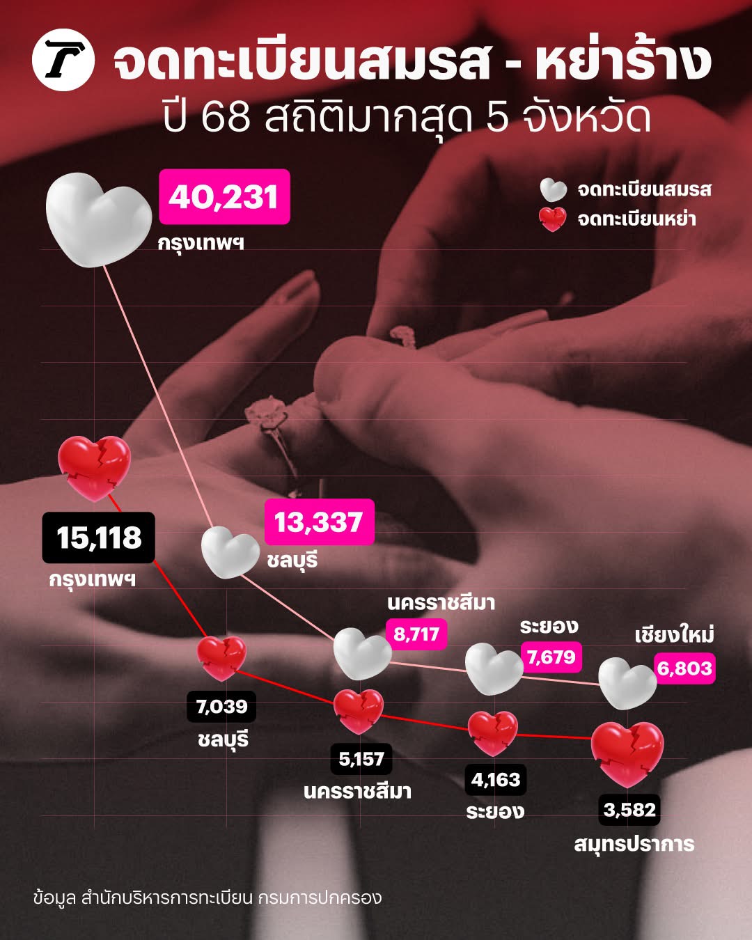 จดทะเบียนสมรส - หย่าร้าง ปี 2568 สถิติมากสุด 5 จังหวัด