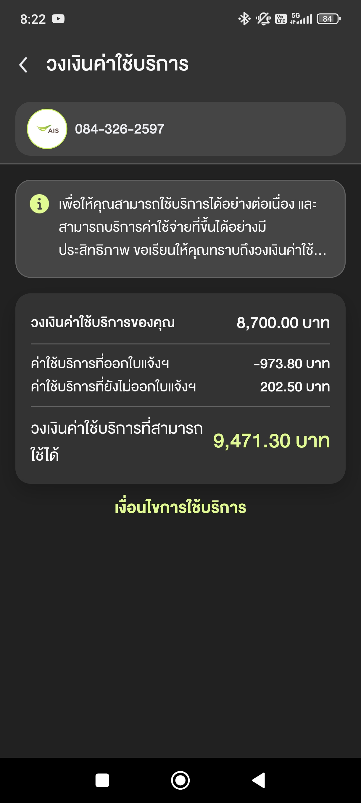 ขอเพิ่มวงเงิน AIS รายเดือนเบอร์ 087-906-2480