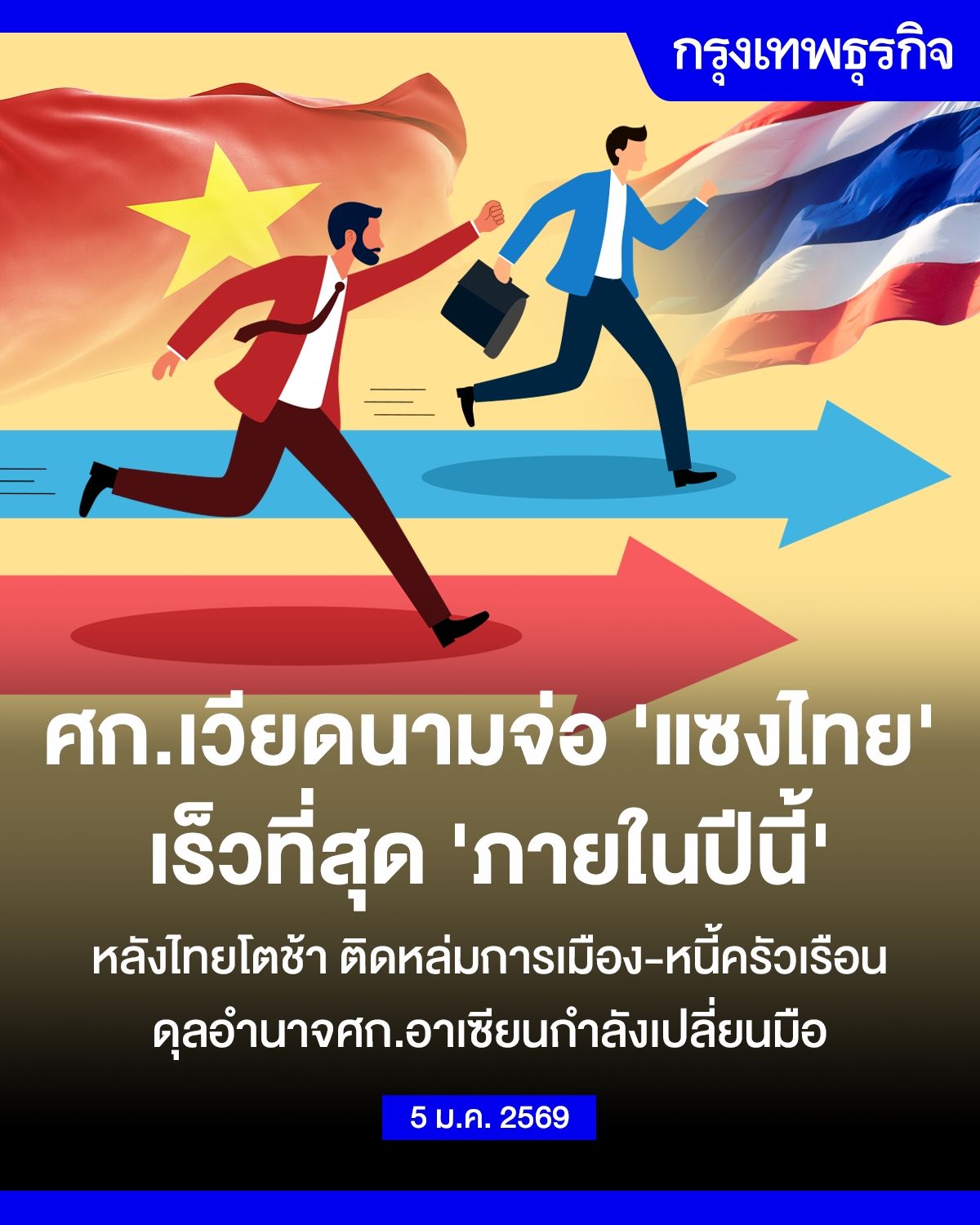 เว็บไซต์นิกเกอิ เอเชียรายงานว่า เวียดนามกำลังมีแนวโน้มจะ “แซงหน้าไทย” ในด้านขนาดเศรษฐกิจที่วัดจากผลิตภัณฑ์มวลรวมในประเทศที่เป็นตัวเงิน (Nominal GDP) ได้เร็วที่สุด “ภายในปีนี้” โดยแรงหนุนหลักมาจากการลงทุนโครงสร้างพื้นฐานขนาดใหญ่ของภาครัฐ ซึ่งช่วยเร่งการเติบโตทางเศรษฐกิจอย่างเห็นได้ชัด ภูมิทัศน์เศรษฐกิจของอาเซียนกำลังเปลี่ยนไป เมื่อความไม่แน่นอนทางการเมืองภายในประเทศและความขัดแย้งตามแนวชายแดนกับกัมพูชา ส่งผลให้เศรษฐกิจไทยชะลอตัวลง