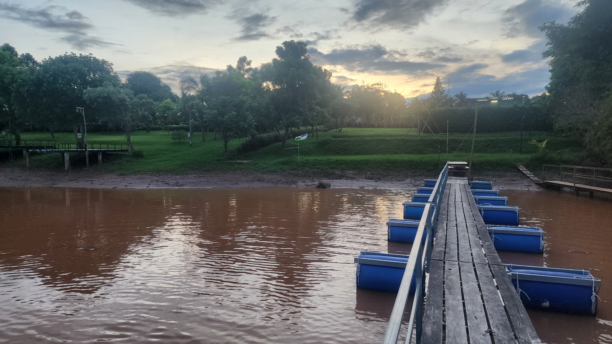 เดินออกมาเล่นกลางน้ำที่กระชังปลาได้