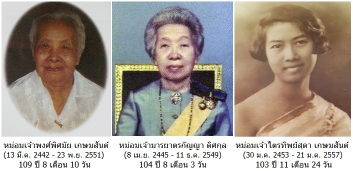 • หม่อมเจ้าภัคยพันธุ์ เกษมสันต์ (๑๕ มีนาคม ๒๔๔๗ - ๒๕ พฤศจิกายน ๒๕๔๘) ๑๐๑ ปี ๘ เดือน ๑๐ วัน