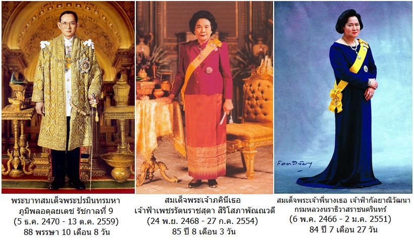 • สมเด็จพระศรีนครินทราบรมราชชนนี (๒๑ ตุลาคม ๒๔๔๓ - ๑๘ กรกฎาคม ๒๕๓๘) ๙๔ พรรษา ๘ เดือน ๒๗ วัน