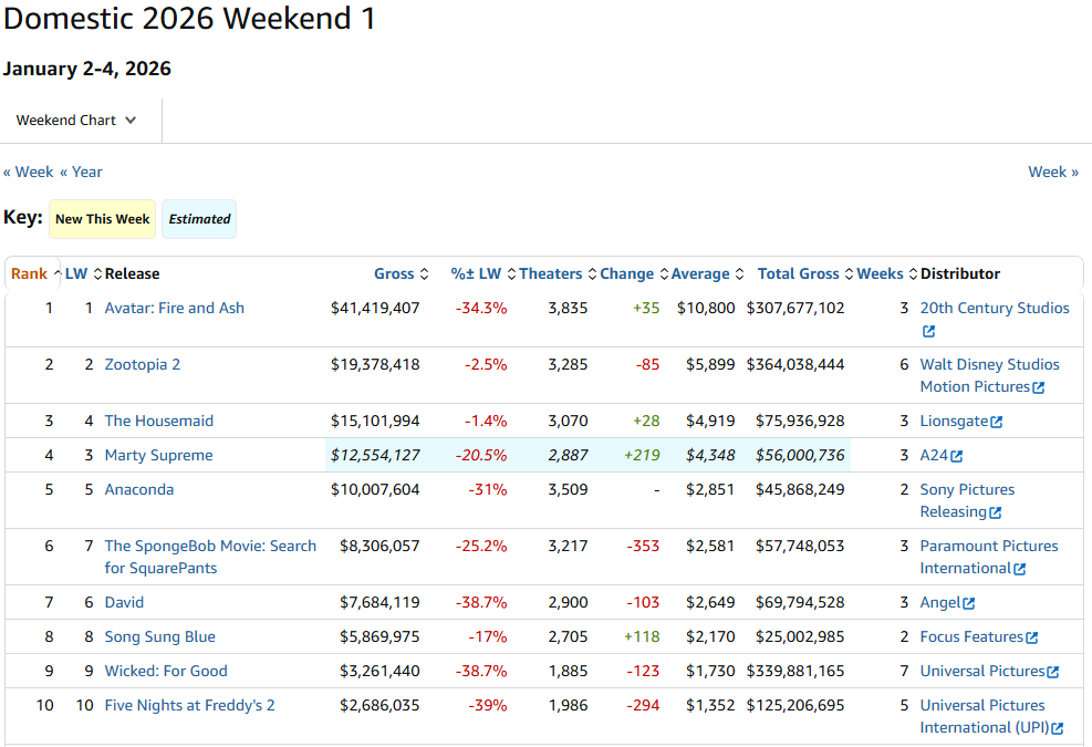 สุดสัปดาห์แรกเปิดหัวปี 2026 ทาง Avatar: Fire and Ash ก็ยังคงครองแชมป์ได้เป็นสุดสัปดาห์ที่ 3 ติดต่อกัน แม้ว่ารายได้จะลดลงไปจากภาค The Way of Water พอสมควร แต่ก็ยังเพียงพอที่จะครองบัลลังก์แชมป์หนังทำเงินในประเทศประเดิมปี 2026 อย่างสวยงามให้ Fox/Disney