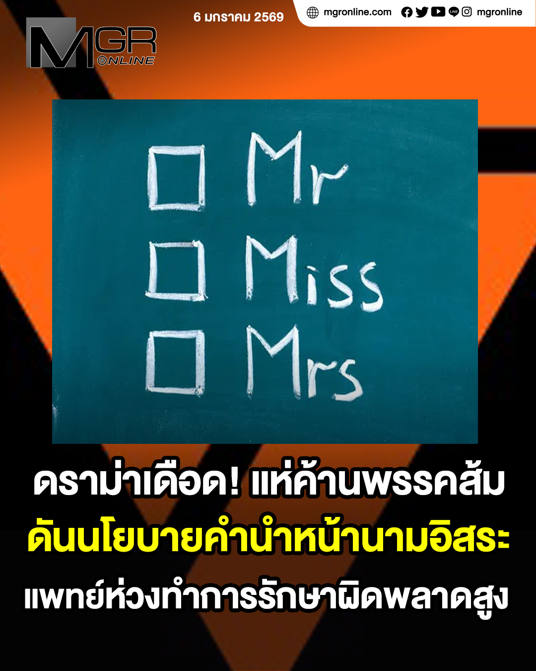แพทย์กังวล! นโยบายพรรคส้ม “คำนำหน้านามตามความสมัครใจ” อาจกระทบระบบสาธารณสุข ชี้ช่องโหว่เสี่ยงวินิจฉัยผิดพลาดในนาทีวิกฤต โดยเฉพาะโรคที่สัมพันธ์กับเพศกำเนิด วอนรับฟังความเห็นต่าง ล่าสุดมีข้อเสนอ “พบกันครึ่งทาง” ให้ระบุเพศกำเนิดในบัตรประชาชนเพื่อการรักษา แต่ใช้คำนำหน้านามตามเพศสภาพได้