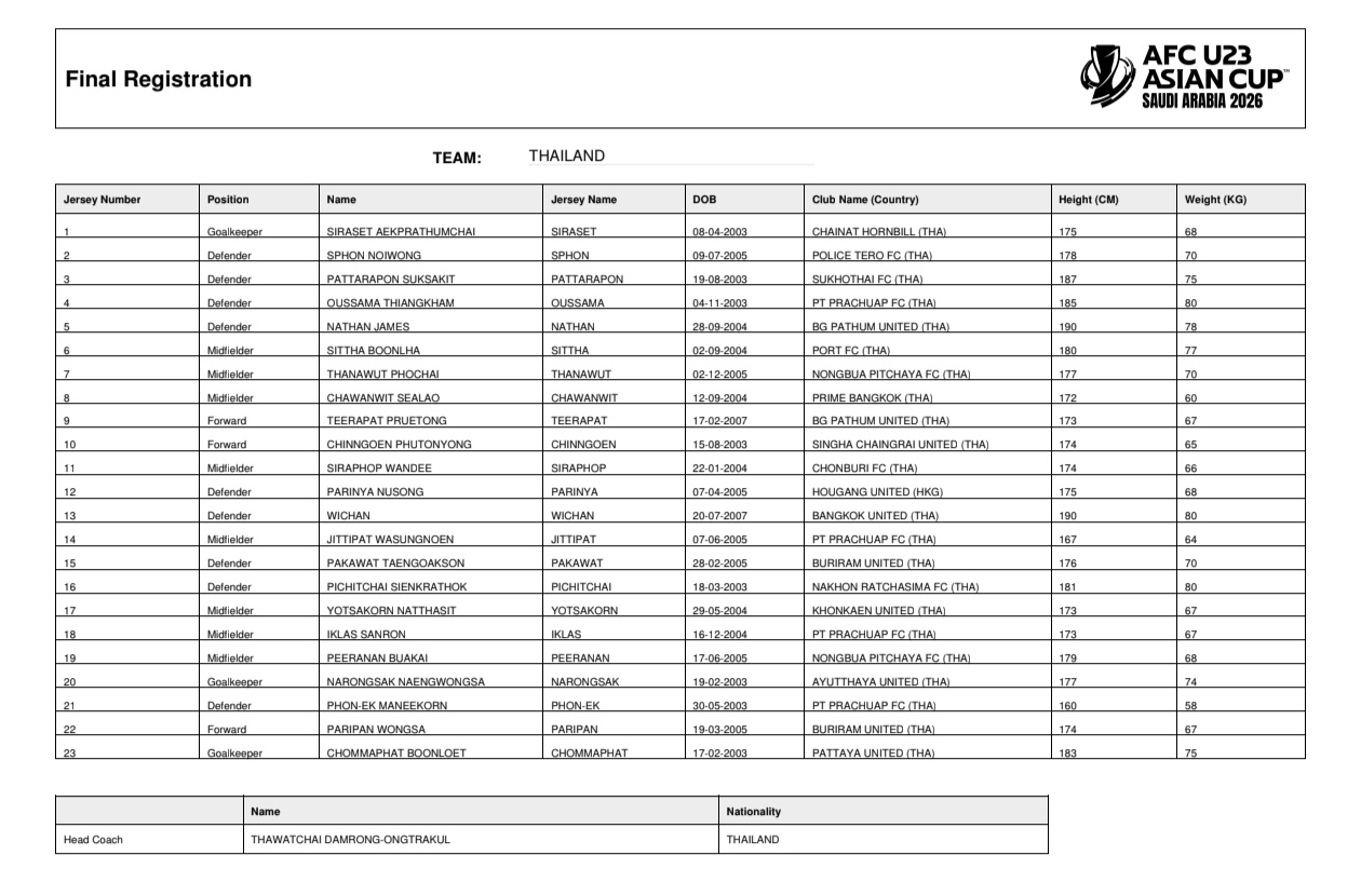 ค่าเฉลี่ยอายุ ส่วนสูง น้ำหนักนักเตะทีมชาติไทยชุด AFC U23 ASIAN CUP 2026