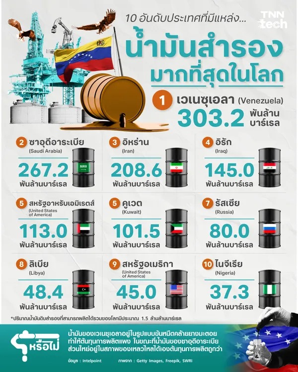 เวเนซุเอลาครองอันดับ 1 ประเทศที่มีน้ำมันสำรองมากที่สุดในโลก 303.2 พันล้านบาร์เรล ตามด้วยซาอุดีอาระเบียและอิหร่าน