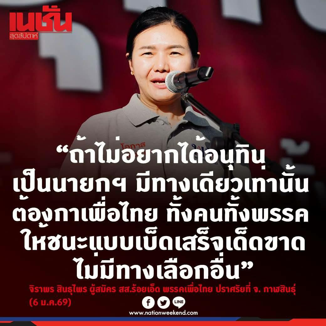 "ถ้าไม่อยากได้อนุทิน เป็นนายกฯ มีทางเดียวเท่านั้น ต้องกาเพื่อไทยทั้งคนทั้งพรรค ให้ชนะแบบเบ็ดเสร็จเด็ดขาด ไม่มีทางเลือกอื่น"