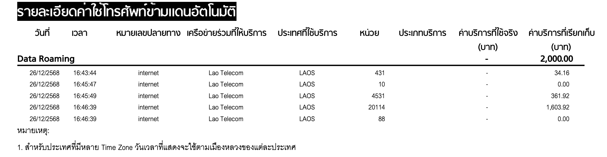 ค่าข้ามแดนอัตโนมัติ (Data Roaming) 2,000 บาท 👉 ทั้งที่ระยะเวลาการโรมมิ่งในบิลโชว์เพียง
