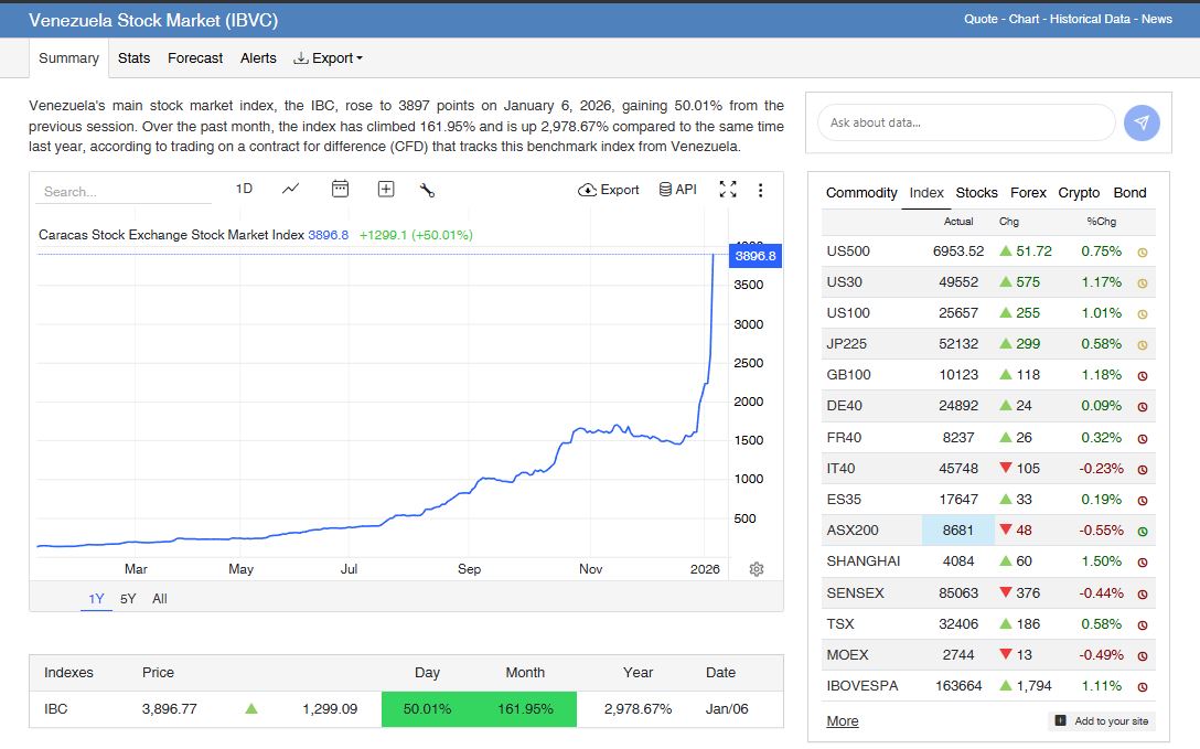 ดัชนีตลาดหุ้นหลักของเวเนซุเอลา (IBC) ปรับตัวขึ้นสู่ระดับ 3,897 จุด เมื่อวันที่ 6 มกราคม 2569 เพิ่มขึ้น 50.01% จากวันก่อนหน้า ในช่วงเดือนที่ผ่านมา ดัชนีปรับตัวขึ้น 161.95% และเพิ่มขึ้น 2,978.67% เมื่อเทียบกับช่วงเวลาเดียวกันของปีที่แล้ว ตามข้อมูลจากการซื้อขายสัญญาซื้อขายส่วนต่าง (CFD) ที่ติดตามดัชนีหลักของเวเนซุเอลา