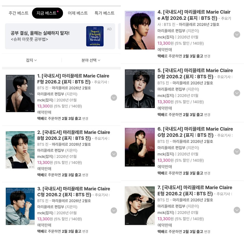 หน้าปกนิตยสาร Marie Claire Korea ของจิน ขึ้นแท่นสินค้าขายดีอันดับ 1 แบบเรียลไทม์บนเว็บไซต์ Aladdin โดยหน้าปกทั้ง 7 แบบ ครองชาร์ตใน 7 อันดับแรกพร้อมกันทั้งหมด โดยนิตยสารรอบแรกบนเว็บไซต์ Aladin ถูก Sold Out ไปแล้ว เพราะรายการสินค้าที่มีกำหนดการจัดส่งเดิมคือวันที่ 22 มกราคม จากทาง Aladin ได้ถูกเปลี่ยนวันจัดส่งเป็นวันที่ 3 กุมภาพันธ์ทั้งหมด ซึ่งหมายความว่า