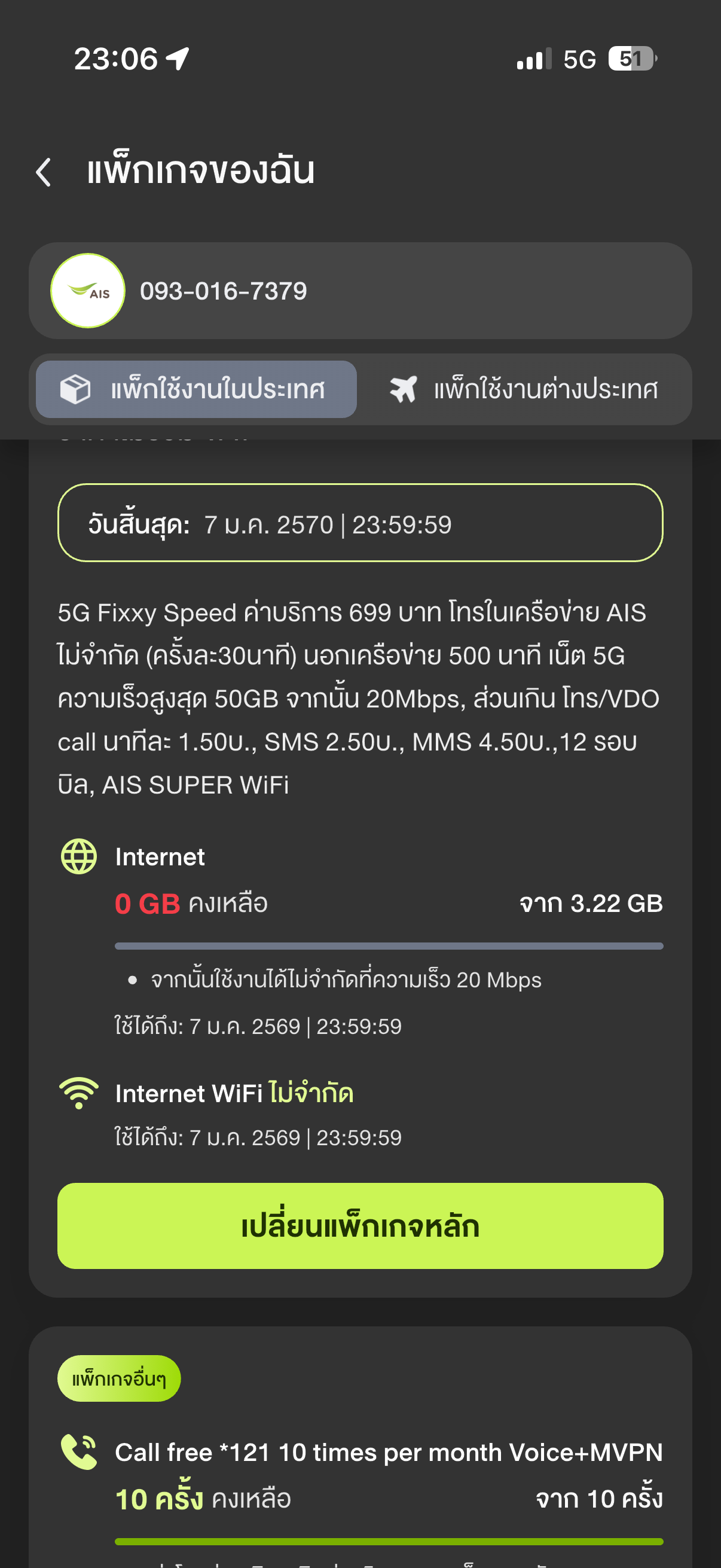 สอบถามปัญหาหน่อยครับ มีใครเจอแบบเดียวกันบ้าง พอดีเปลี่ยนเเพคเกจเน็ตมาเป็น โปร 5G fixxy 699 บาท ที่ให้เน็ตความไวสูงสุด จำนวน 50 GB ถ้าเน็ตหมด จะปรับความเร็วเหลือ 20 mbps และมีค่าโทร500 บาท ประมาณนี้ แต่สมัครเสร็จแล้วพอเริ่มใช้ไป 30 นาที มีข้อความแจ้งว่าเน็ตของผมหมดแล้ว ให้สมัครแพคเสริมบลาๆ ซึ่งปกติ เน็ต 50GB ไม่น่าหมดภายใน 30 นาที และพอผมเข้าไปดูในแอพ พบว่ามีปริมาณเน็ตเพียง 3.22 gb ซึ้งเหลือ 0 และค่าโทรศัพท์เพียง 32 บาท ไม่ทราบว่าเป็นเพราะอะไรครับ