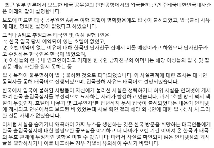 การปกปิดหรือบิดเบือนข้อเท็จจริงจนก่อให้เกิดข่าวปลอมในลักษณะนี้ อาจสร้างความวิตกกังวลโดยไม่จำเป็นแก่ชาวไทยที่ประสงค์จะเดินทางไปประเทศเกาหลี และอาจส่งผลกระทบเชิงลบต่อความสัมพันธ์อันดีที่สั่งสมมาอย่างยาวนานระหว่างไทยและเกาหลี สถานเอกอัครราชทูตฯ จึงใคร่ขอความร่วมมือ โปรดใช้ความระมัดระวังในการรับรู้หรือเผยแพร่ข้อมูลข่าวสารจากแหล่งที่มาที่ยังไม่ได้รับการยืนยันข้อเท็จจริง