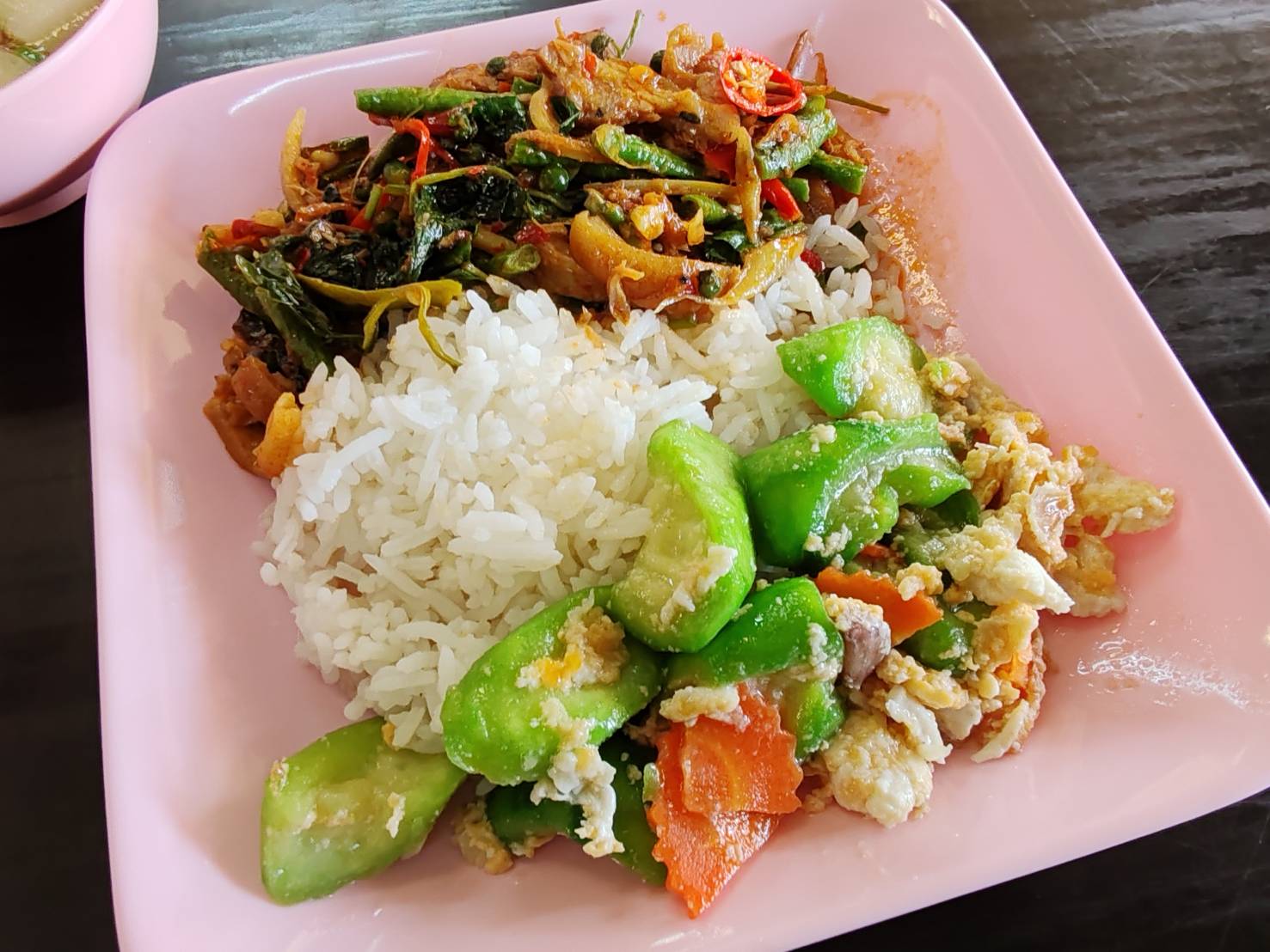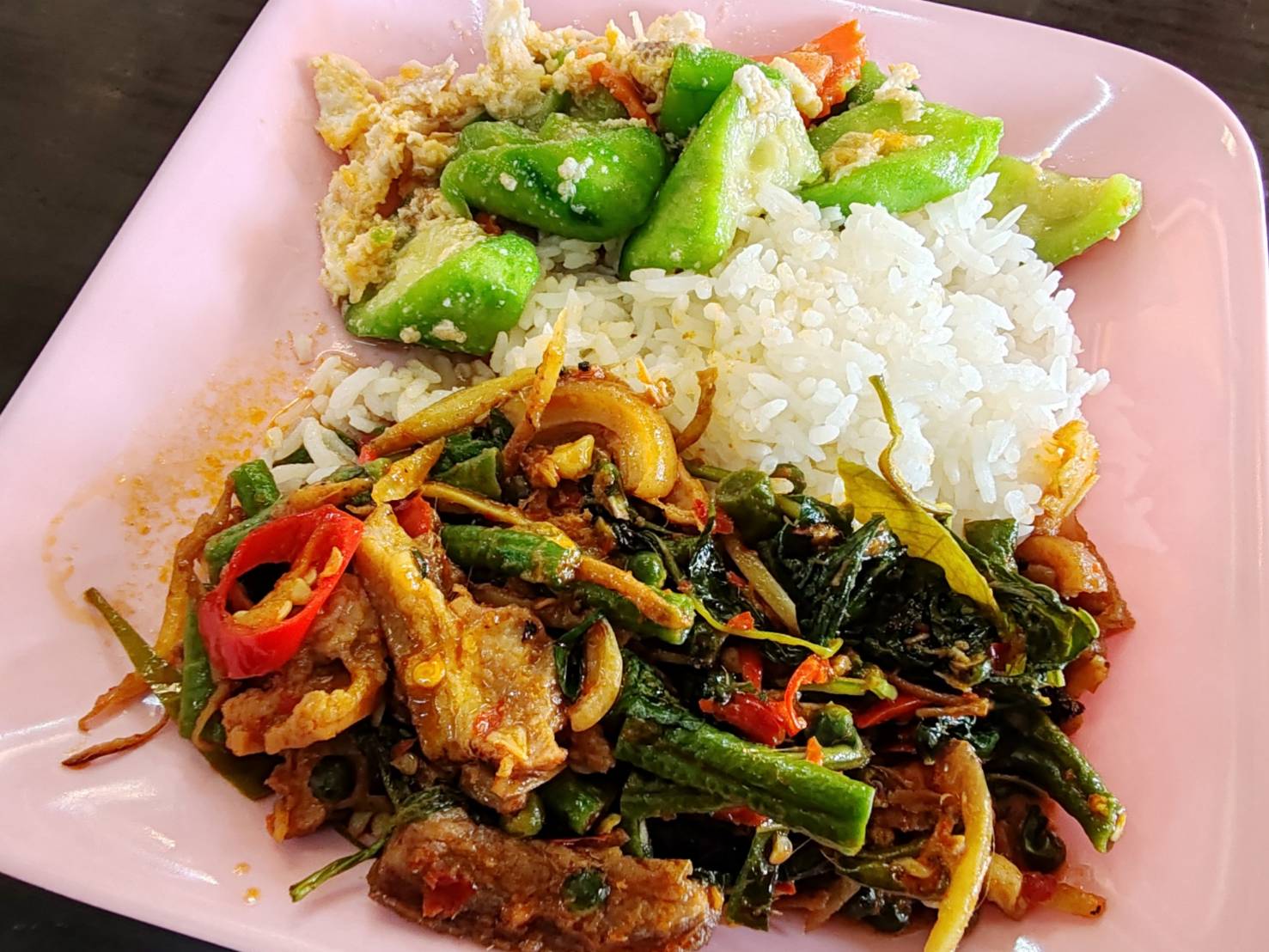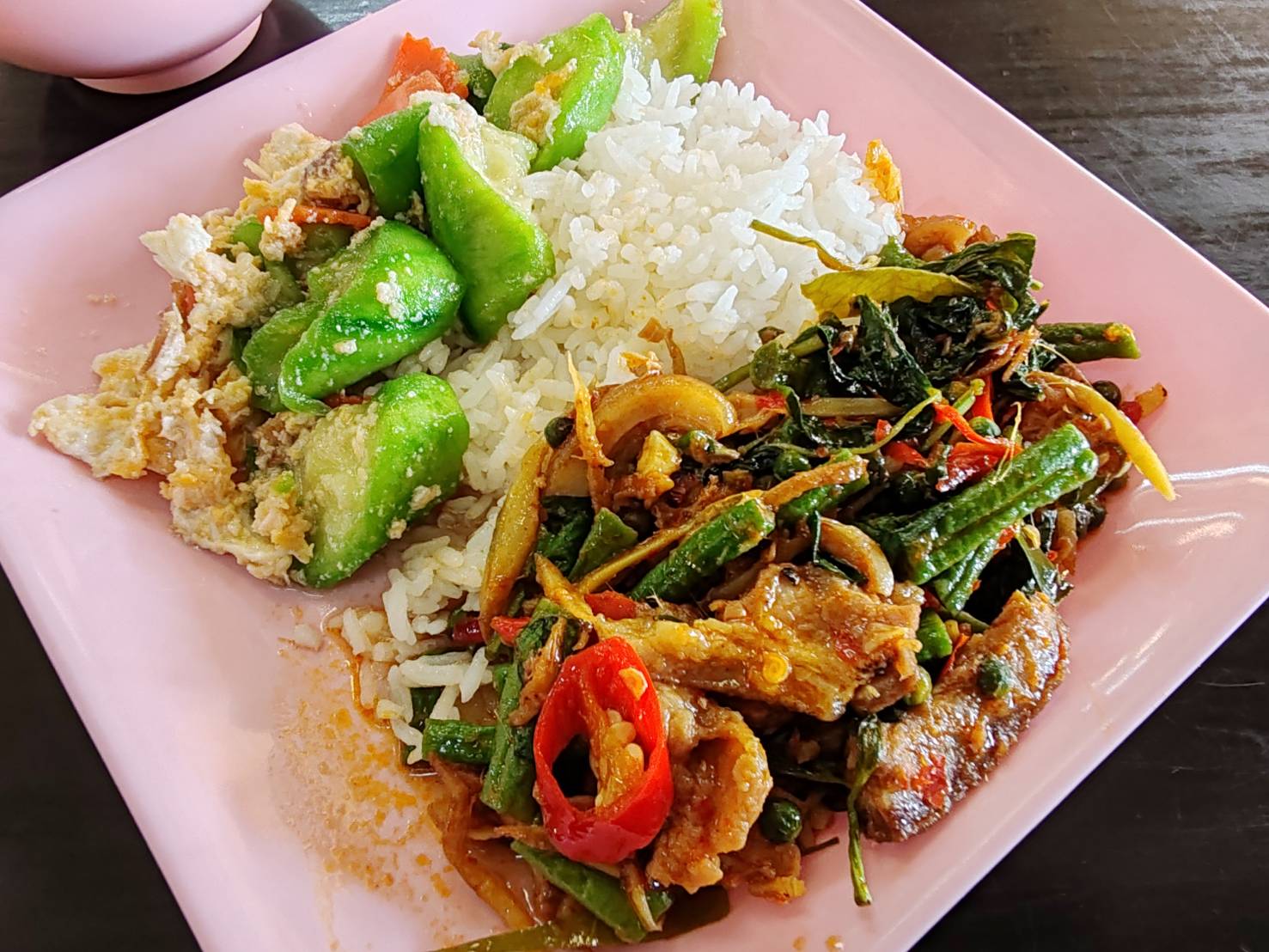 เลยสั่ง หมูป่าผัดเผ็ด ราดข้าว 2 อย่าง 40 บาท บอกเจ๊ เอาข้าวน้อย อิอิ